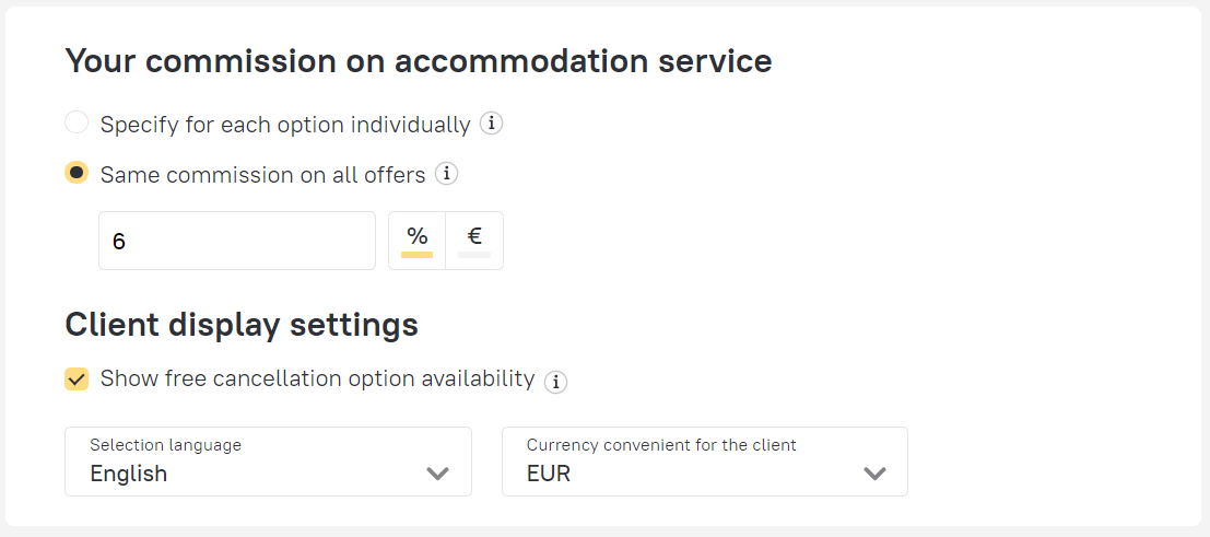Solution: hotel selections on RateHawk contain a special field Your commission for accommodation services. No matter what format is used (a link or a pdf file) the client will see only the final price. And there’s another advantage: you can set your commission separately for each rate!