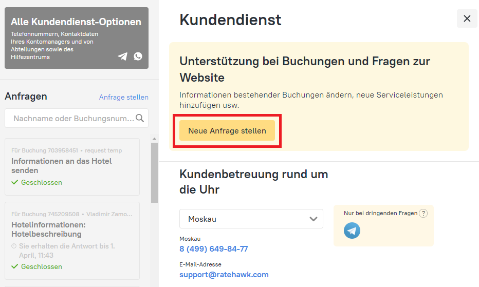 Sie können die Anfrage direkt von der Buchungsseite oder vom Support-Bereich aus senden. Gehen Sie wie folgt vor: