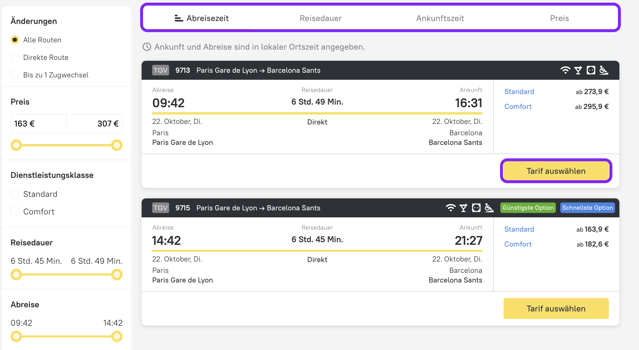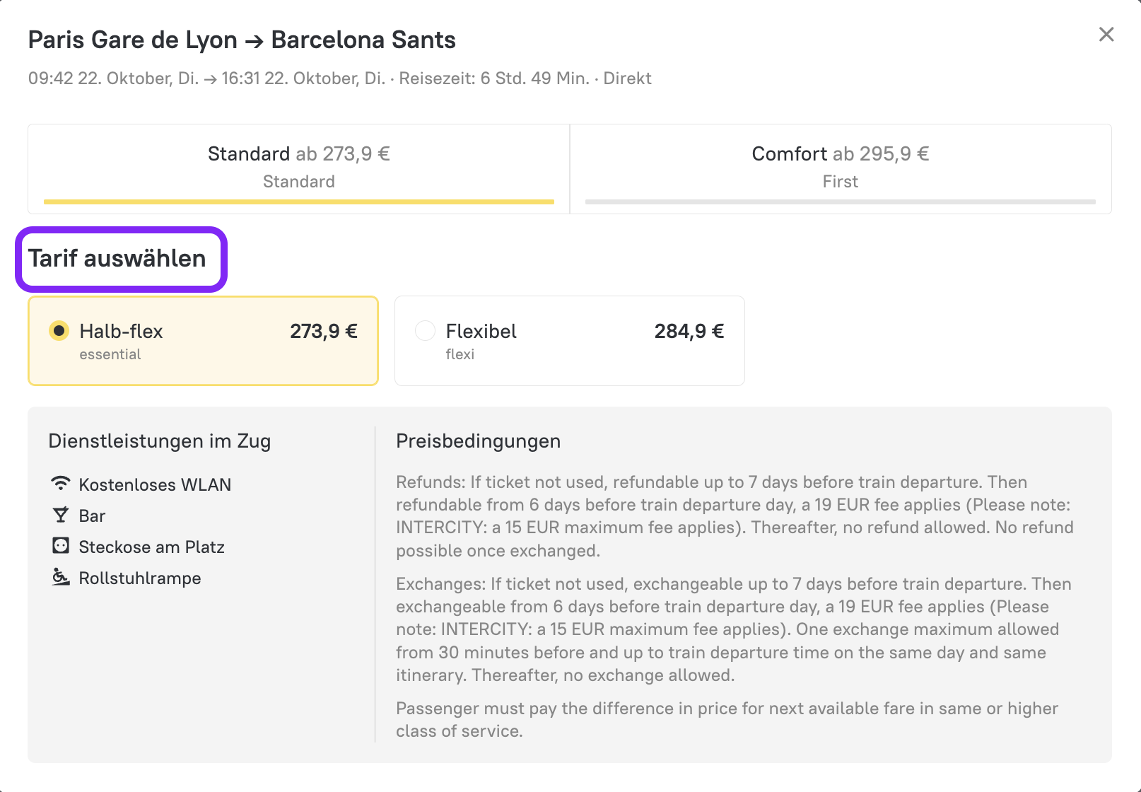 - Überprüfen Sie die Suchergebnisse, wählen Sie den passenden Zug aus und klicken Sie auf „Tarif auswählen“