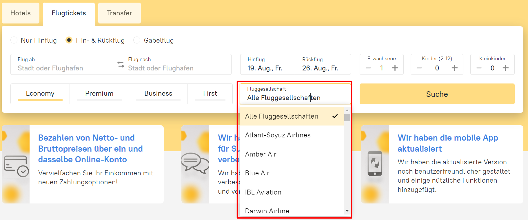 Mit dem neuen Filter können Sie Angebote einer bestimmten Fluggesellschaft schnell finden – geben Sie einfach die gewünschte Fluggesellschaft ein, wenn Sie das Flugziel und das Abflugdatum auswählen. Dies ist vor allem bei beliebten Reisezielen wichtig, bei denen einige Angebote sonst nicht in den Suchergebnissen erscheinen würden.