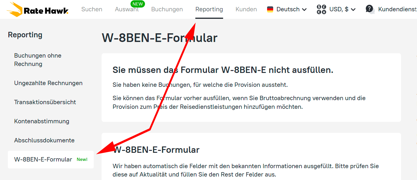Wir können die Provisionen für Bruttoaufträge erst nach Erhalt des W8 Steuerformulars auf Ihrem Konto gutschreiben, daher empfehlen wir, das Dokument gleich auszufüllen und direkt zu hinterlegen.