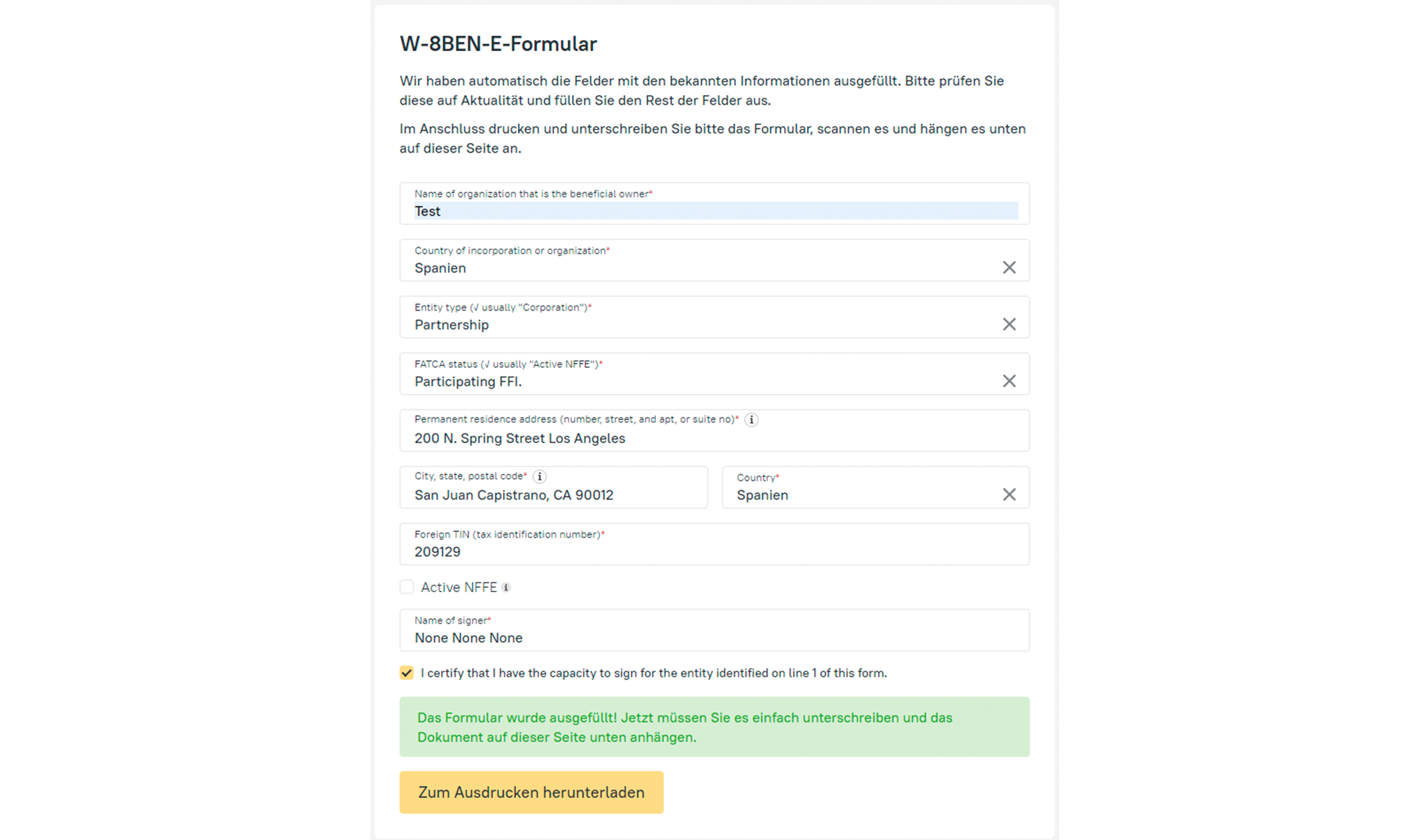 Wir haben in Ihrem Online-Konto ein W8 Steuerformular generiert und mit den Informationen vorausgefüllt, die wir bereits kennen.