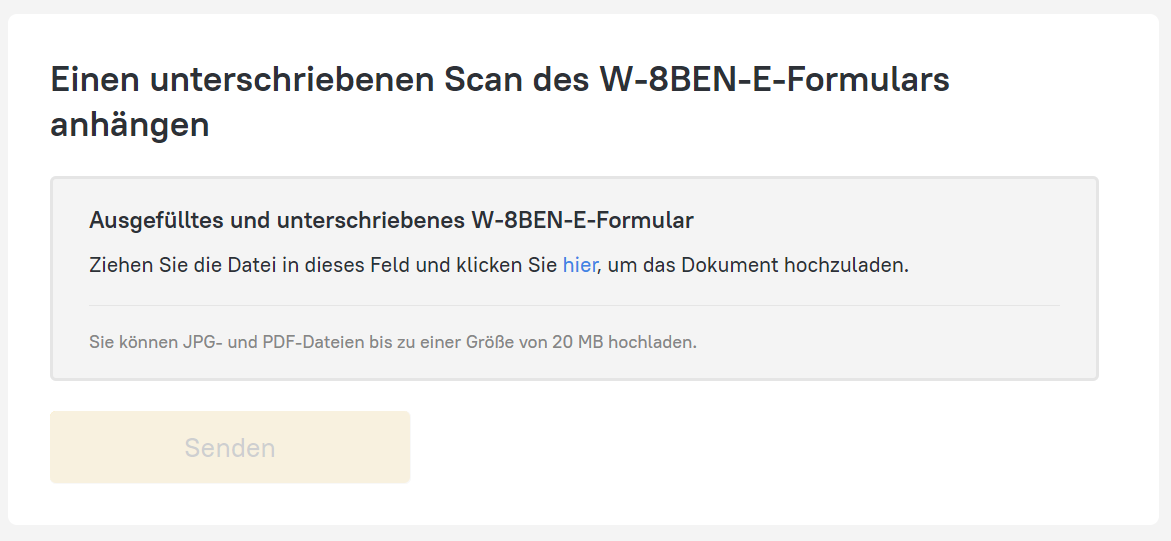 Wir haben in Ihrem Online-Konto ein W8 Steuerformular generiert und mit den Informationen vorausgefüllt, die wir bereits kennen. Alles, was Sie tun müssen, ist, das Dokument zu überprüfen, fehlende Informationen zu ergänzen, es zu unterschreiben und es in das System hochzuladen.