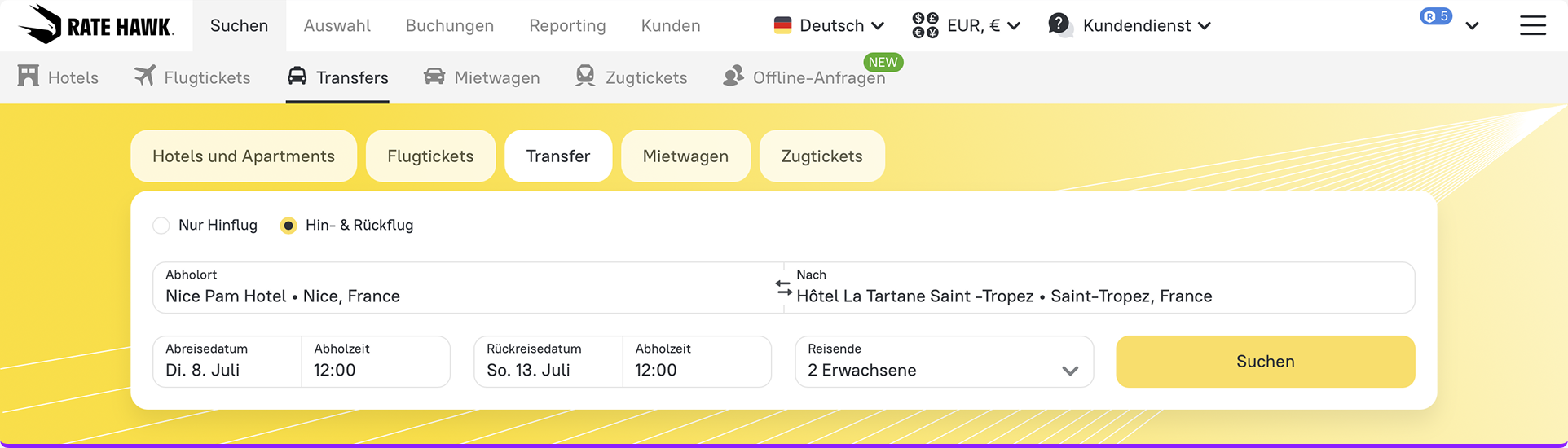 Die neue Funktion für Hin- und Rücktransfers optimiert Ihren Buchungsprozess und steigert Ihre Produktivität. Sparen Sie Zeit und profitieren Sie von einem reibungslosen Ablauf von Anfang bis Ende.