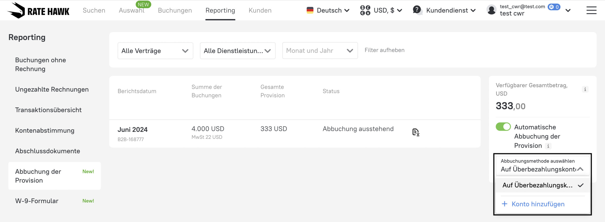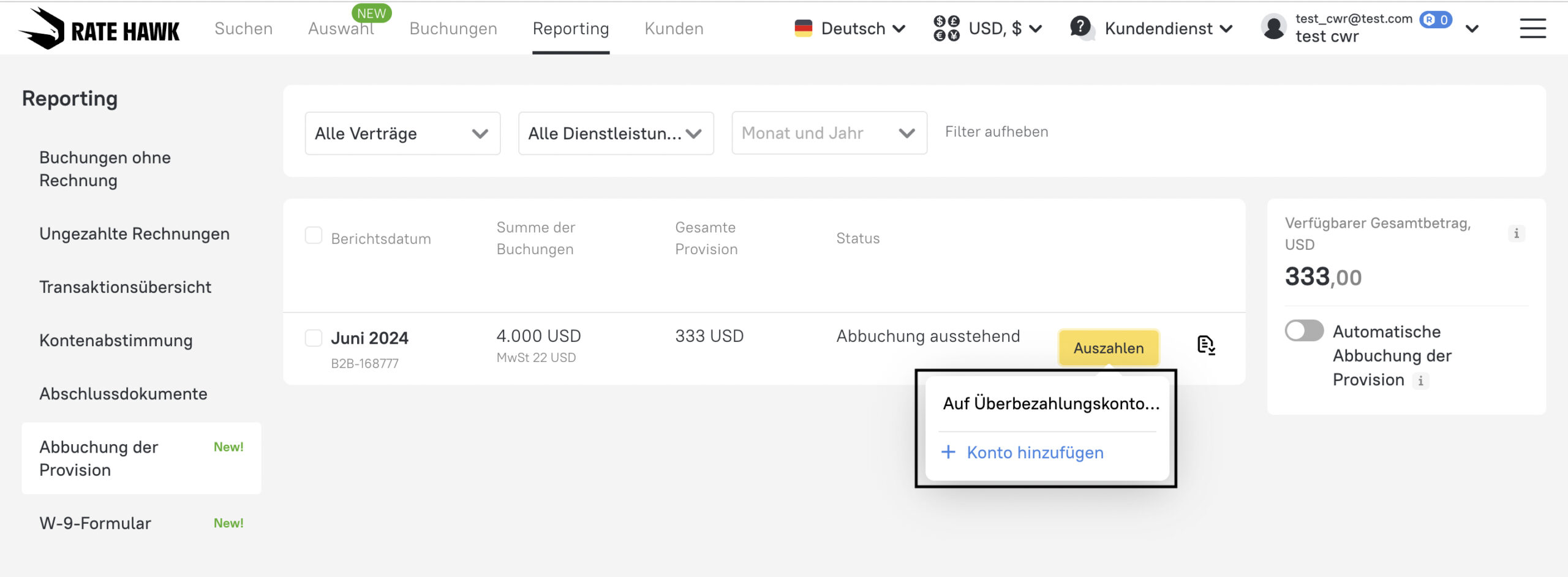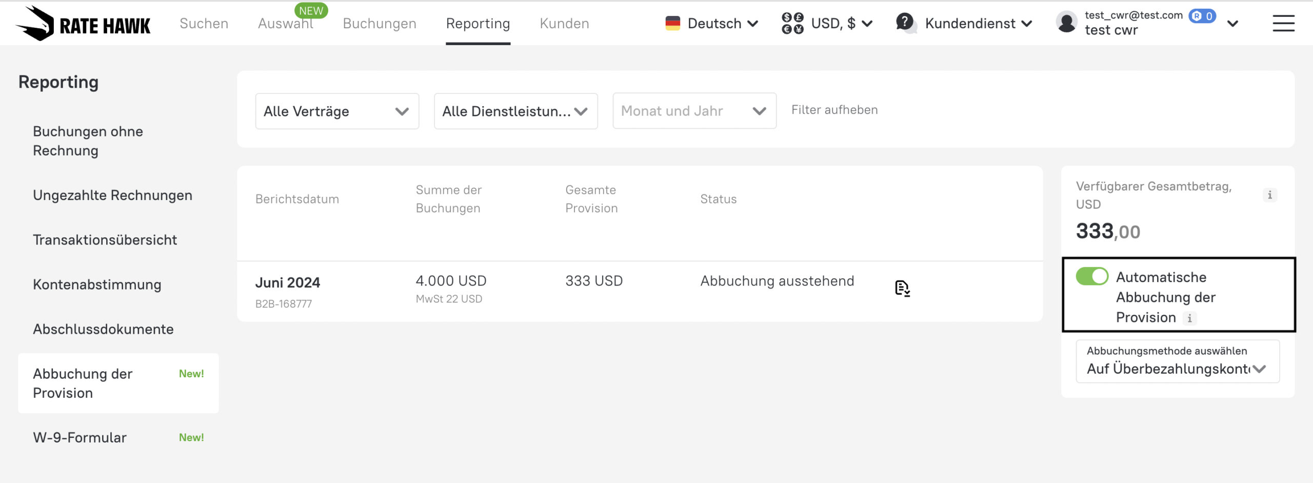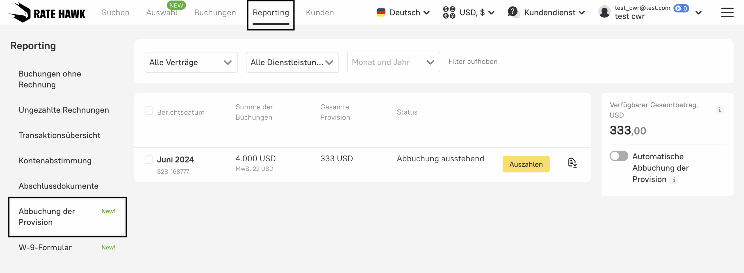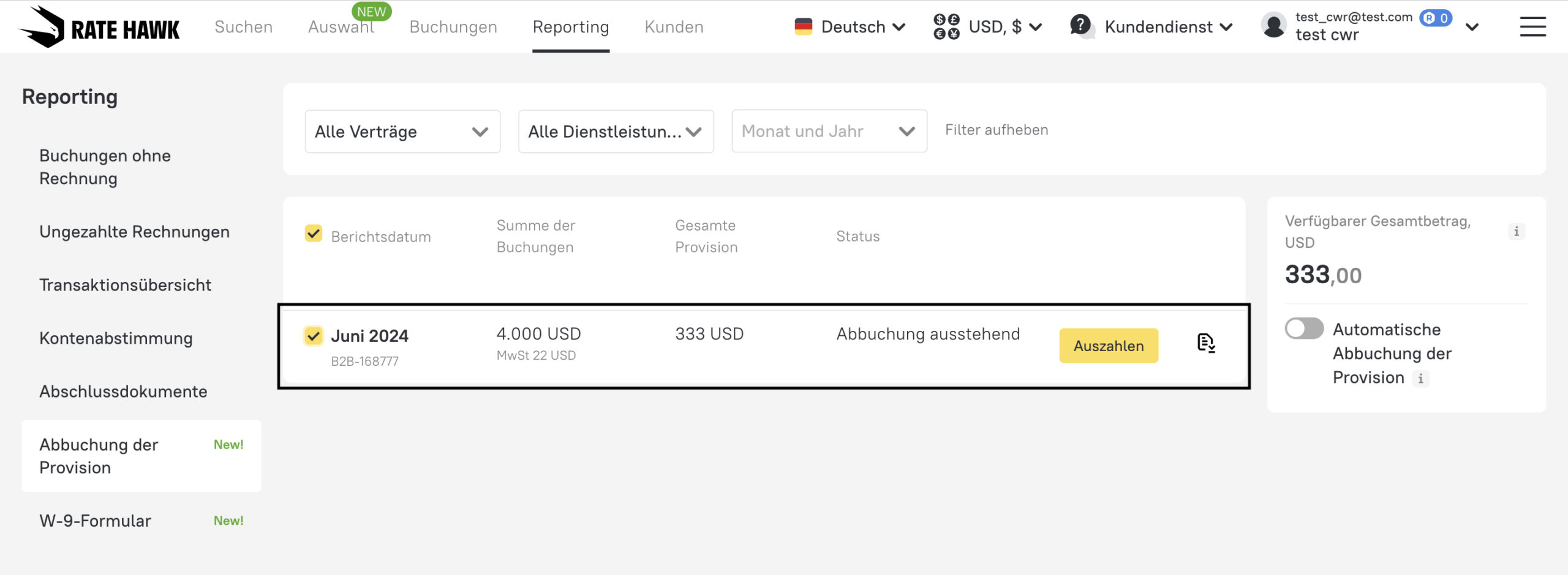 1. Navigieren Sie unter dem Menüpunkt „Reporting“ zu „Abbuchung der Provision“.