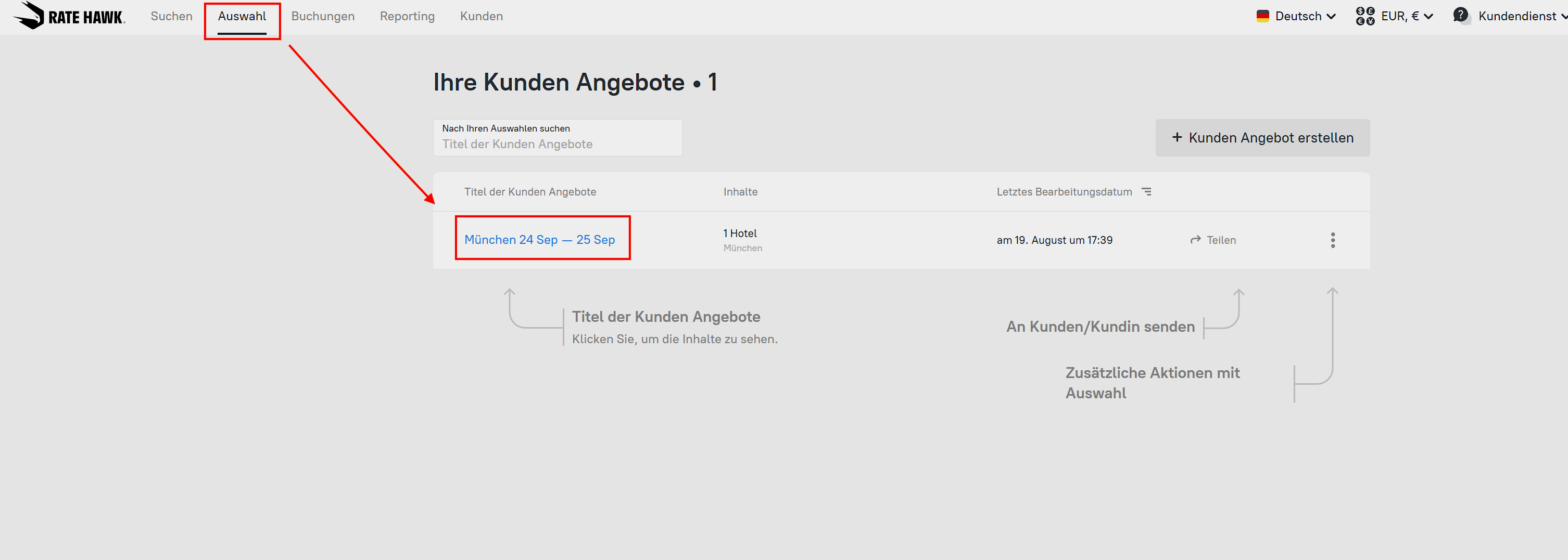 3. Nachdem Sie eine Auswahl erstellt haben, navigieren Sie zum Menüpunkt „Auswahl“ und klicken auf die gewünschte Angebotsauswahl in Ihrer Liste.