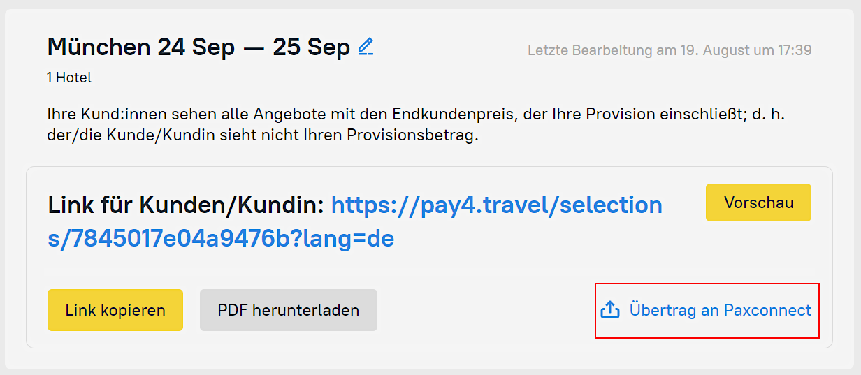 4. Klicken Sie anschließend in den Details der Auswahl auf die Schaltfläche „Übertrag an paxconnect“. Dadurch werden alle Angebote aus der Auswahl an die paxlounge übertragen.