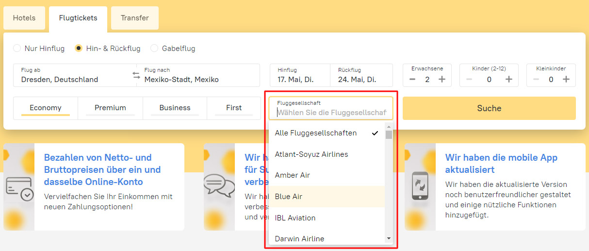 Dank der neuen Funktion können Sie die Suche nach der gewünschten Fluggesellschaft filtern, während Sie gleichzeitig das Ziel und das Datum des Hinflugs festlegen. Auf diese Weise werden in den Suchergebnissen alle Angebote der ausgewählten Fluggesellschaft angezeigt. Dies ist besonders bei beliebten Reisezielen von Bedeutung, bei denen es so viele Angebote von verschiedenen Fluggesellschaften gibt, dass nicht alle Optionen in den Suchergebnissen enthalten sind.
