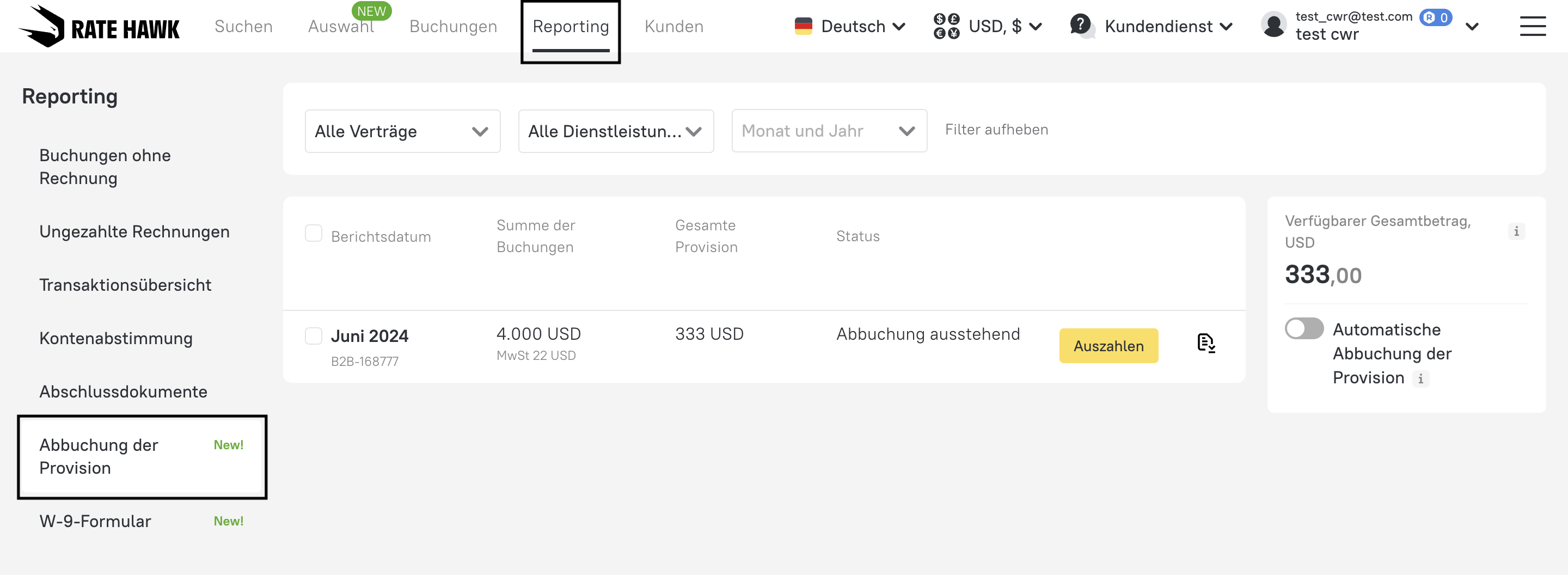 Reisevermittler: innen mit Master- und Finanzfunktion können ihre Provisionen entweder direkt einzeln verwalten oder automatische Abhebungen einrichten, und zwar für alle innerhalb eines Monats getätigten Buchungen.
