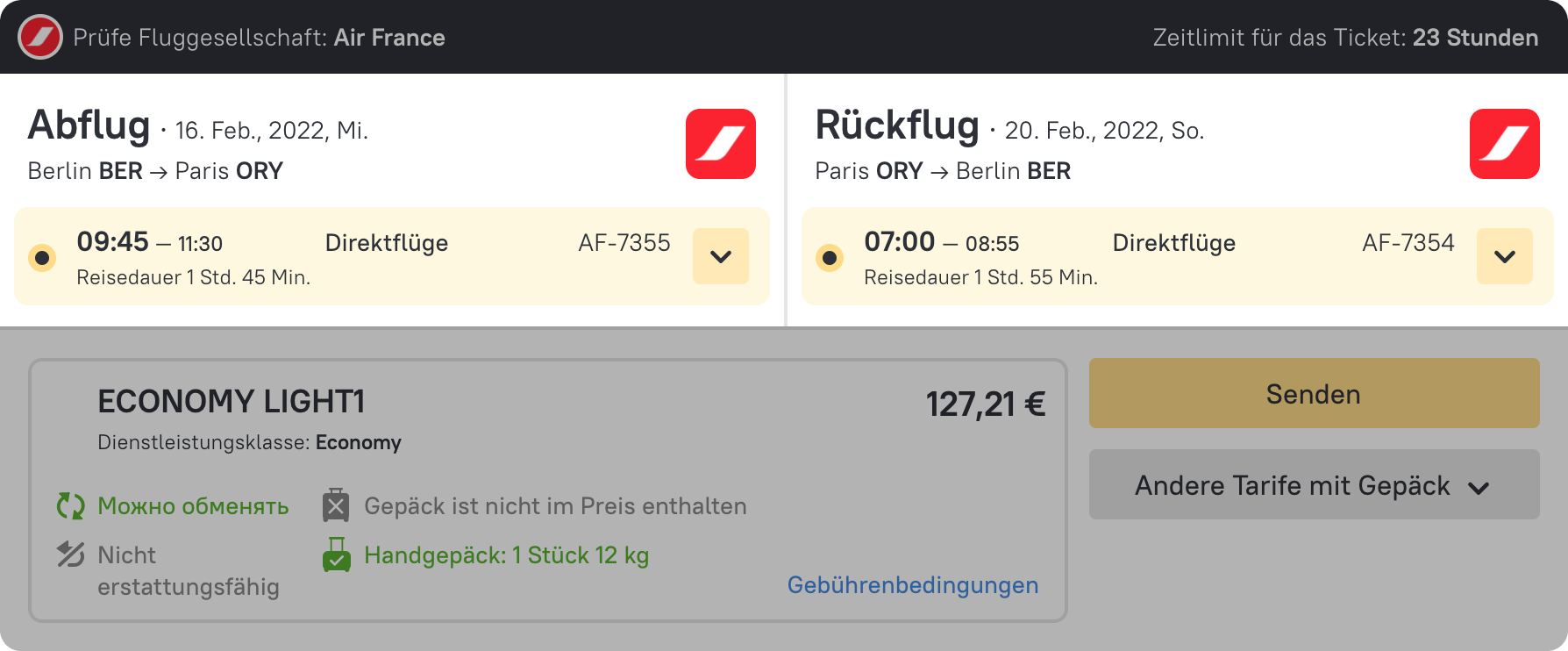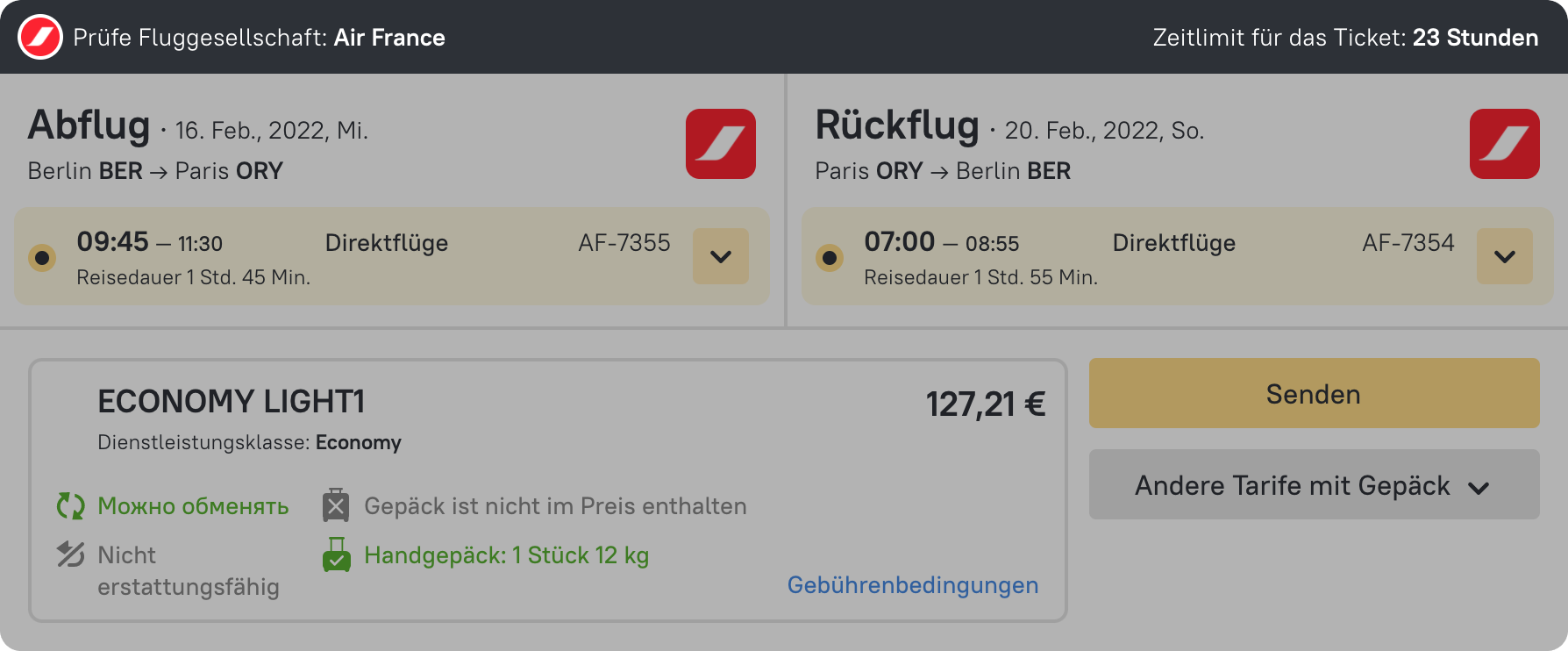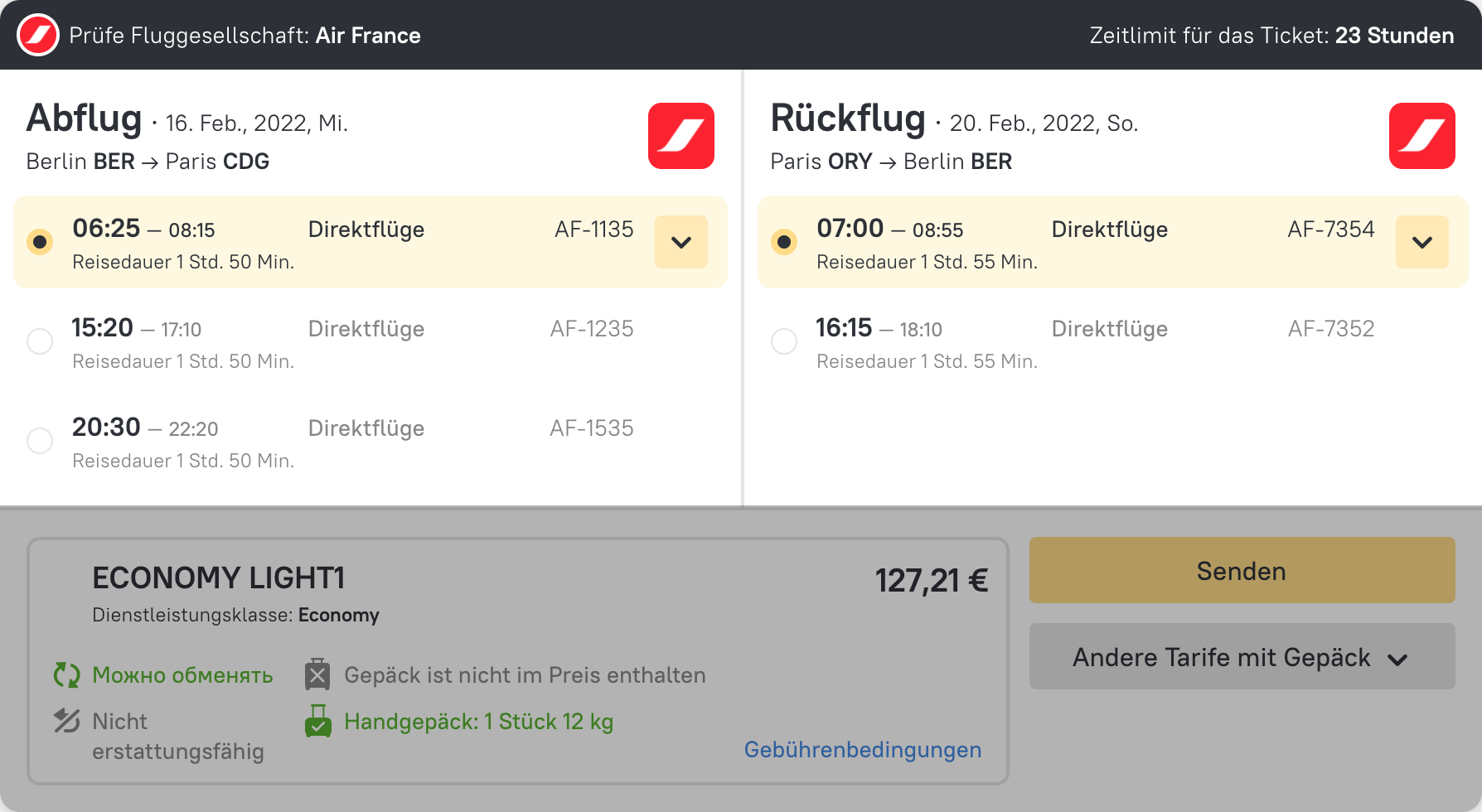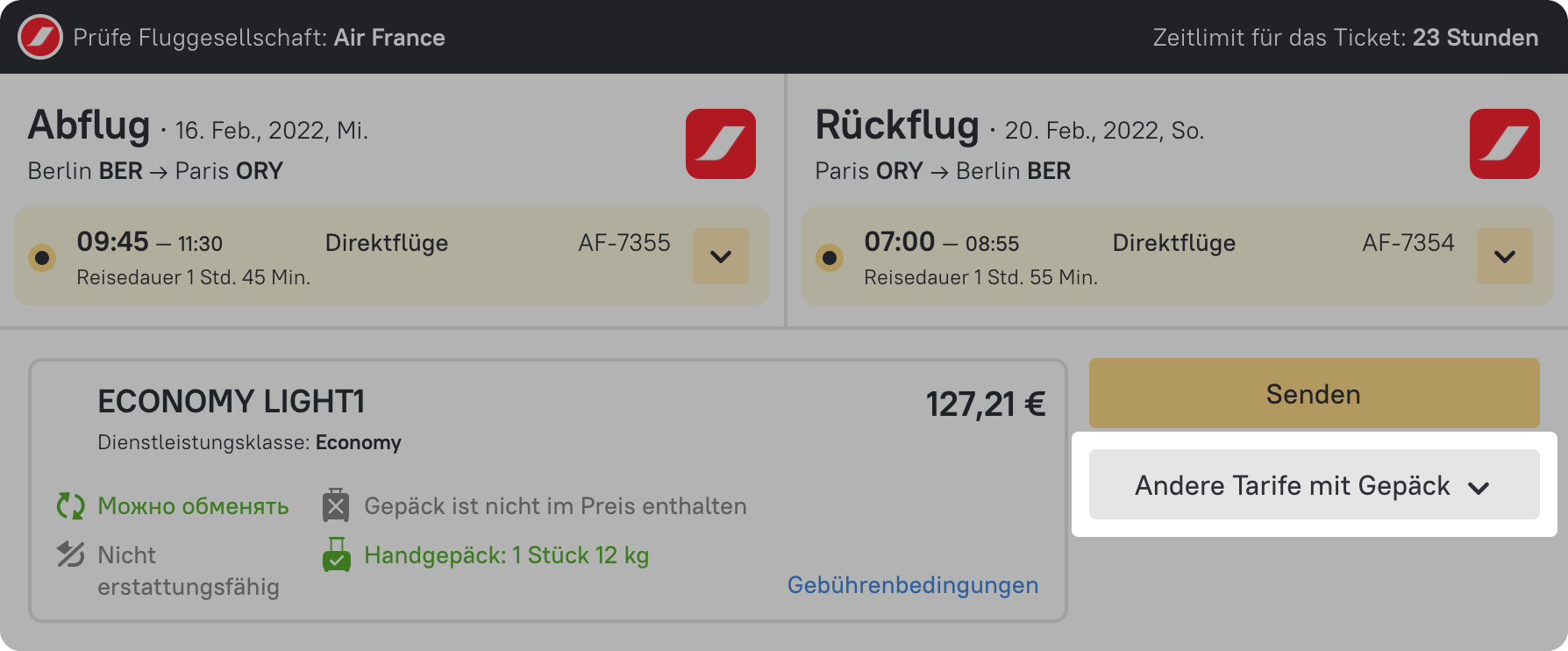 Wenn für die angegebene Flugoption andere Tarife verfügbar sind, können Sie dies leicht erkennen und mit nur einem Klick zu ihnen wechseln. Die entsprechende Schaltfläche befindet sich jetzt in der unteren rechten Ecke unter der Schaltfläche Auswahl.