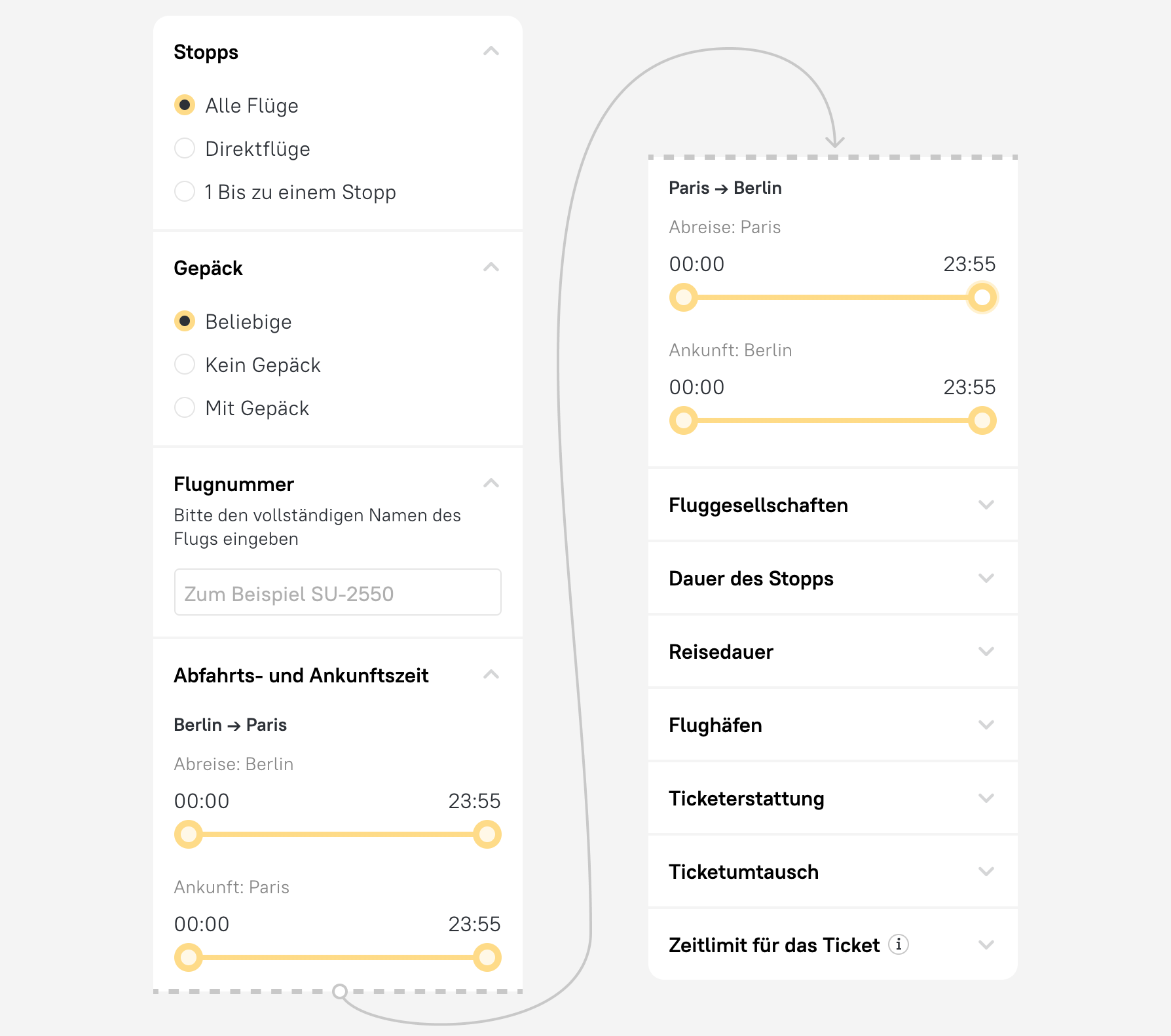 Wir haben alle erforderlichen Filter beibehalten, aber wir haben sie verständlicher gemacht und in eine praktische Reihenfolge gebracht. Jetzt können Sie noch schneller eine bequeme Zeit für Ihren Flug auswählen, indem Sie z.B. Stop-over ausschließen, Optionen mit Gepäck auswählen und vieles mehr.