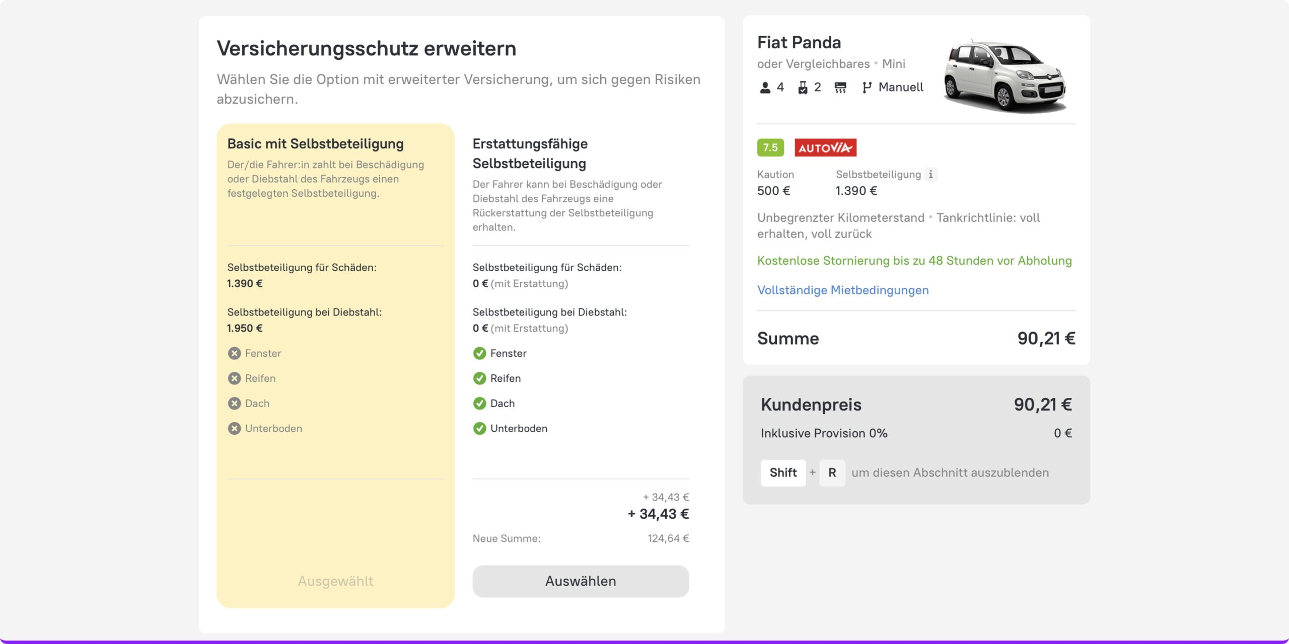 Versicherungs-Upgrade für Mietwagen im Buchungsformular