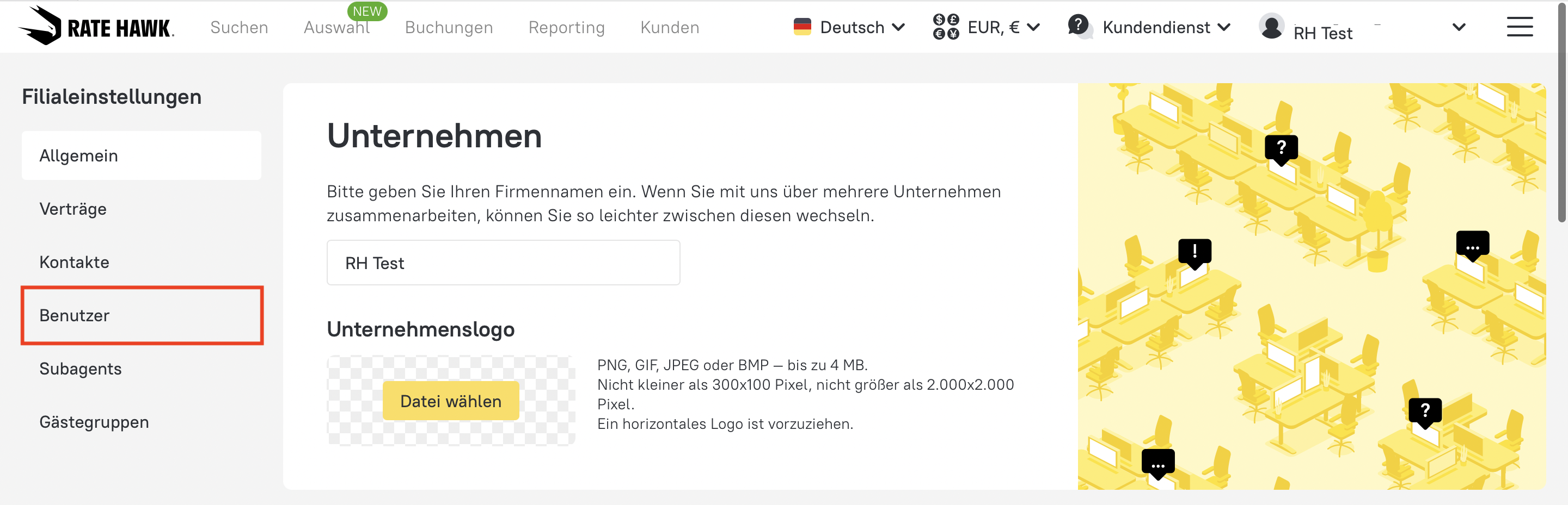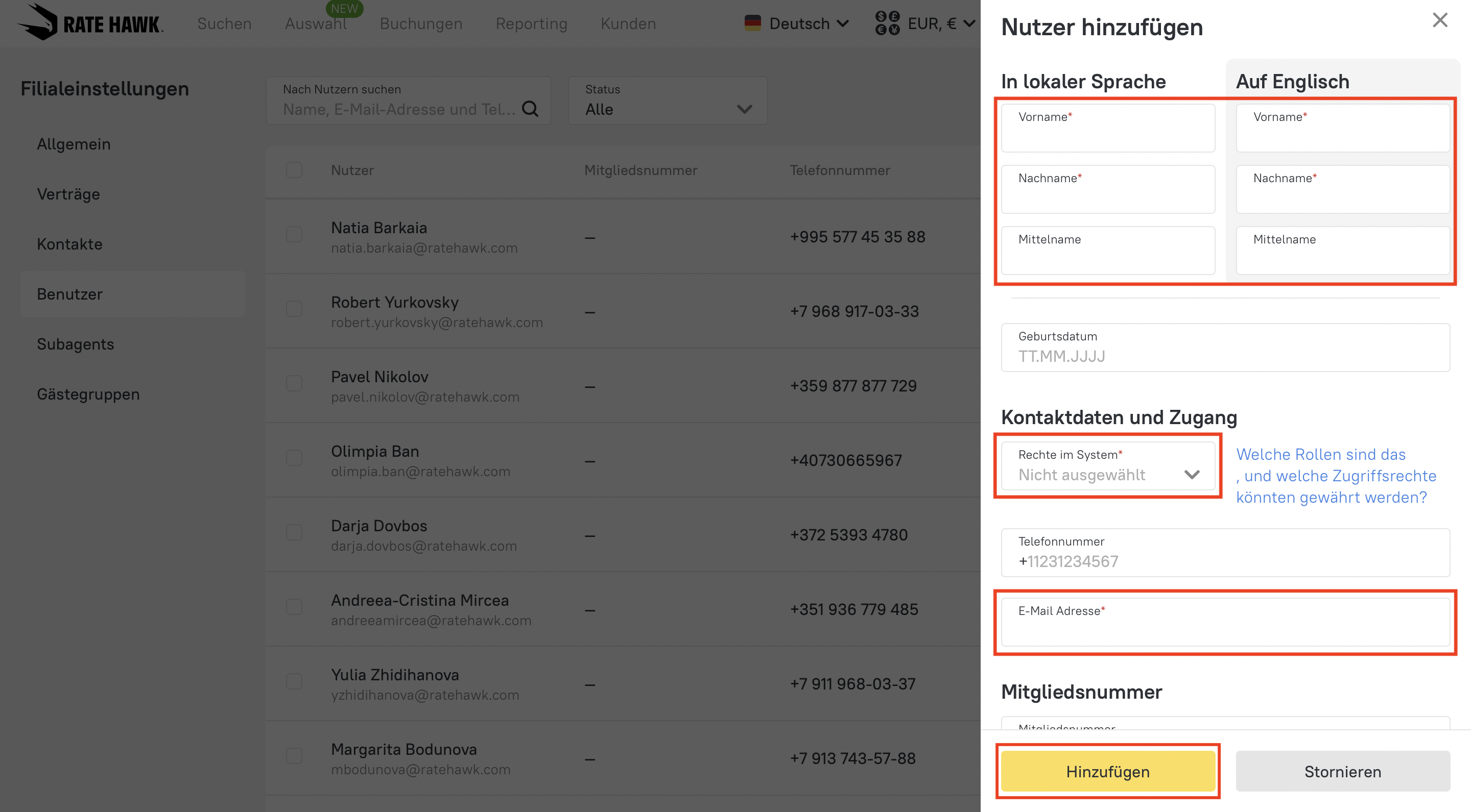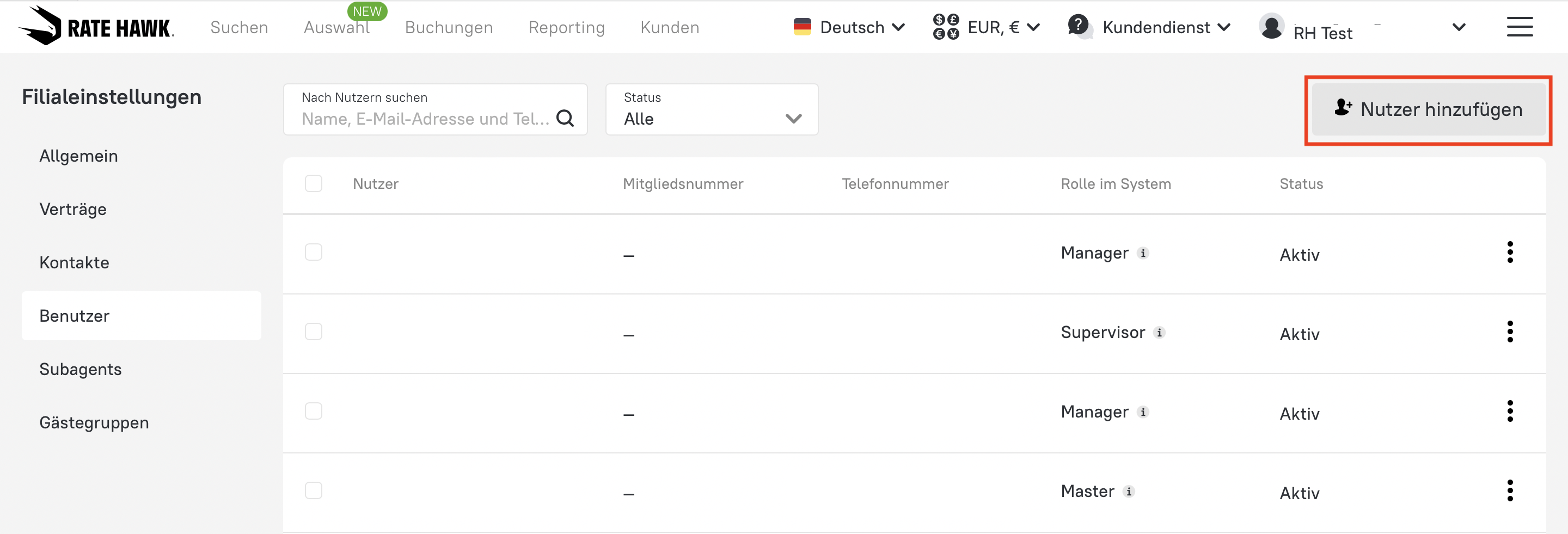 Sobald alle Nutzer mit ihren eigenen RateHawk-Profilen registriert sind, können die Mitarbeiter mit der Master-Rolle einzelne Rollen zuweisen und verwalten und neue Nutzer zum Konto hinzufügen. In dieser Position können sie auch Nutzer in Finance- oder Managerpositionen nur Zugang zu Bereichen erteilen, die für ihre Rolle notwendig sind.