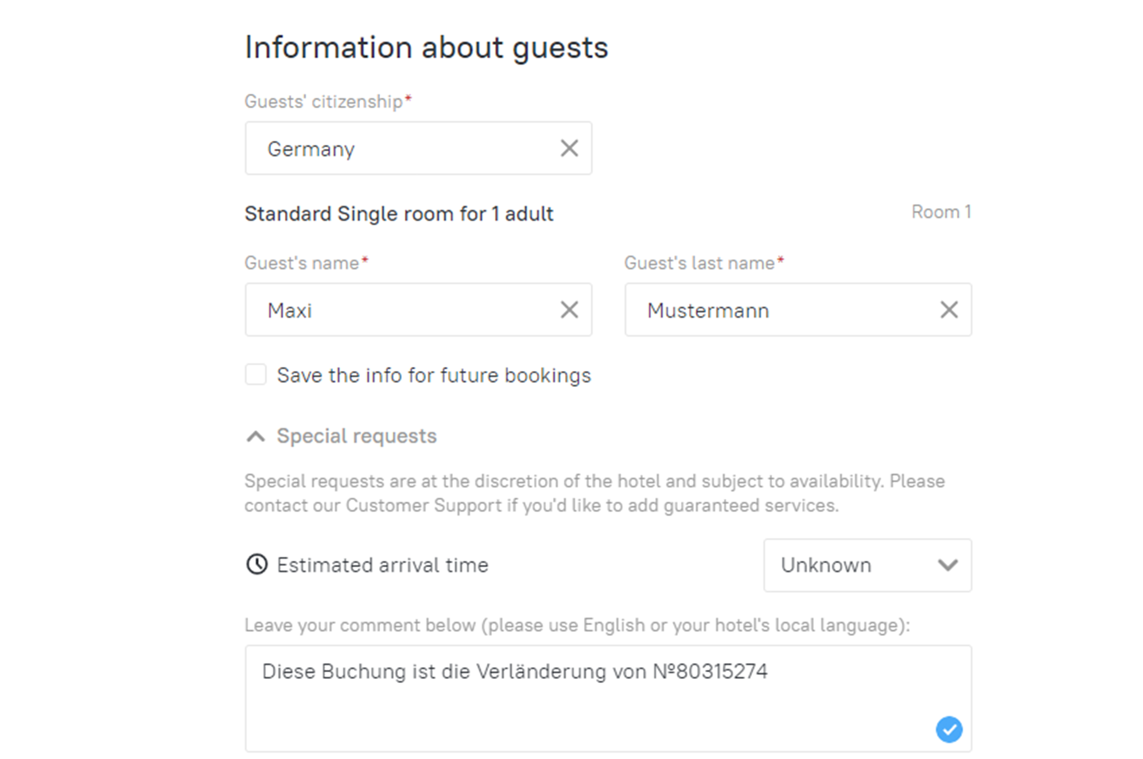 Der einfachste Weg ist eine zusätzliche Nacht (oder Nächte) mit einer neuen Buchung zu buchen. Bitte hinterlassen Sie einen Kommentar bevor Buchungsabschluss.