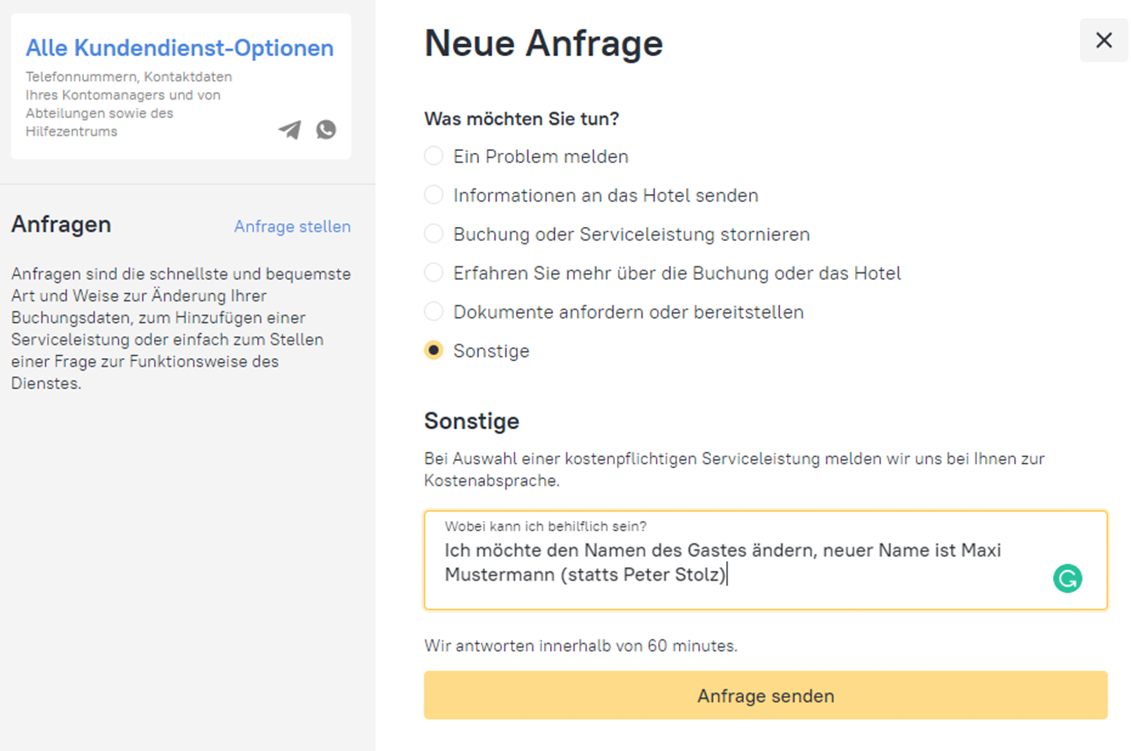 - Sie können eine der vorgeschlagenen Anfragen wählen. Wenn Sie ihre eigene Anfrage stellen möchten, wählen Sie Sonstige und schreiben sie die Anfrage.