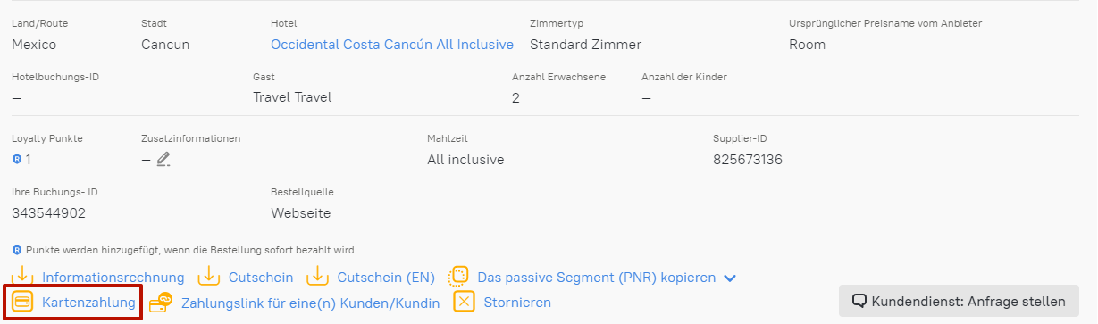 - Wählen Sie die Buchung aus und klicken Sie auf den Button „Kartenzahlung“ unten, um die jeweilige Buchung zu bezahlen.