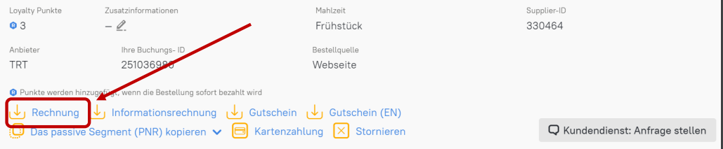 Gehen Sie in Ihr Backoffice und klicken Sie auf die Buchung. Klicken Sie auf den Button „Rechnung“, um die Rechnung als PDF-Datei zu erhalten (dort stehen die Bankdaten und die Rechnungsnummer).