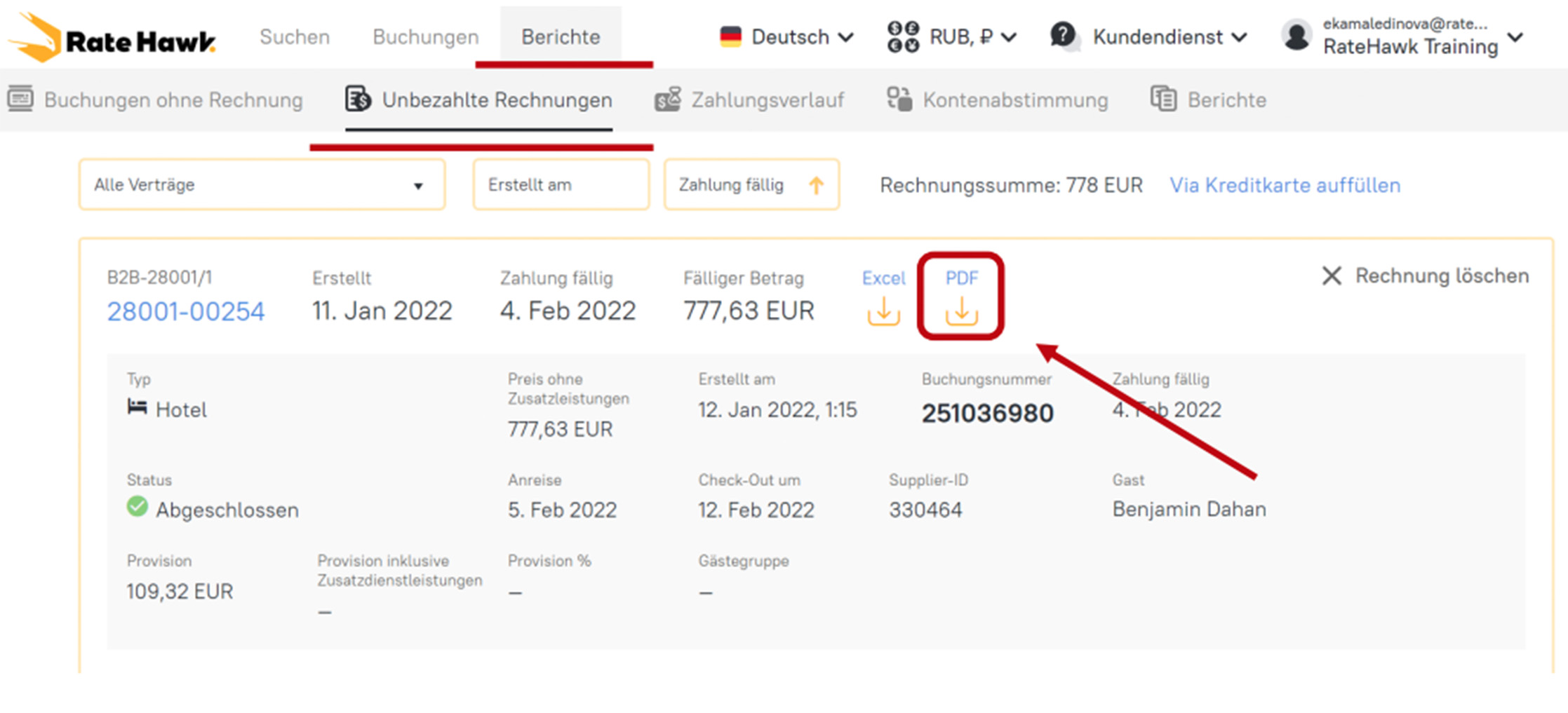 Unter dem Tab Berichte finden Sie alle Ihre unbezahlten Rechnungen. Um die Rechnung via PDF zu erhalten, klicken Sie auf „PDF“.
