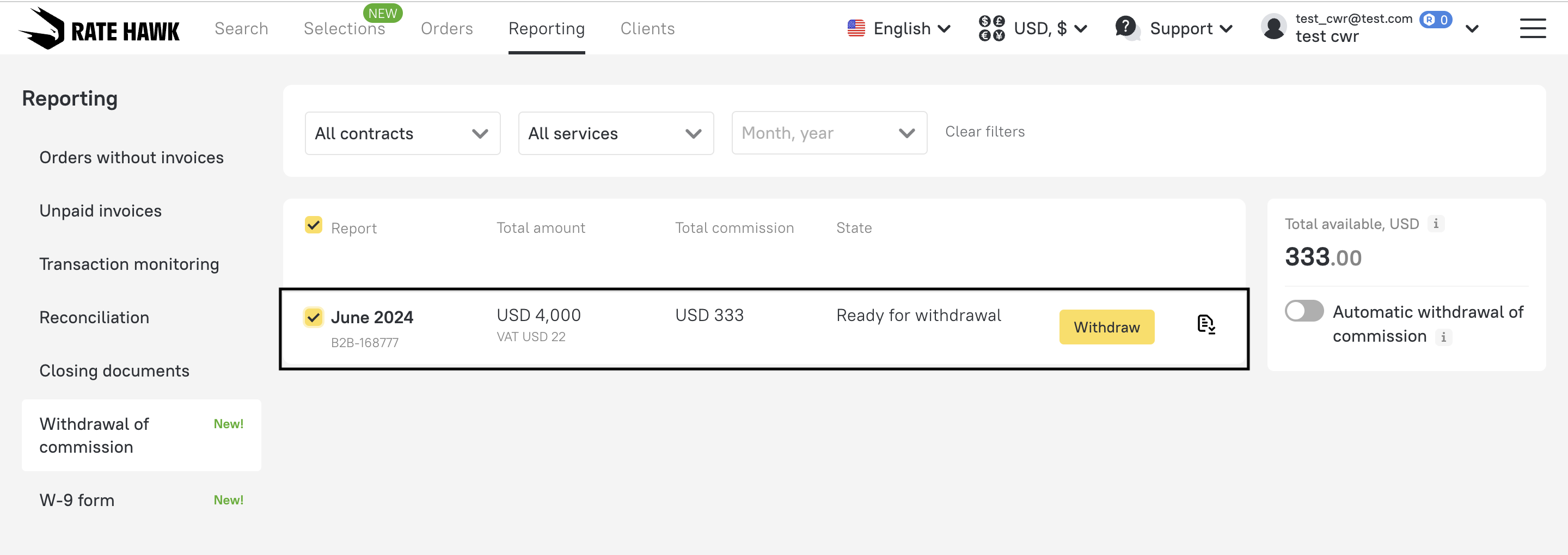 1. Access the “Reporting” tab and select “Withdrawal of commission.”