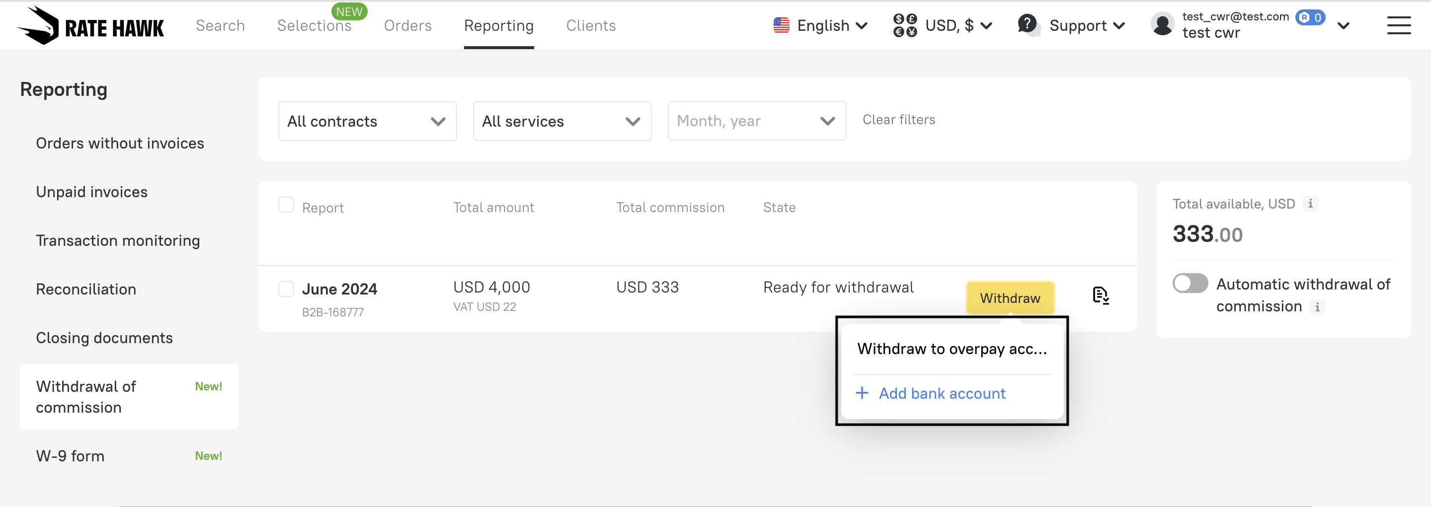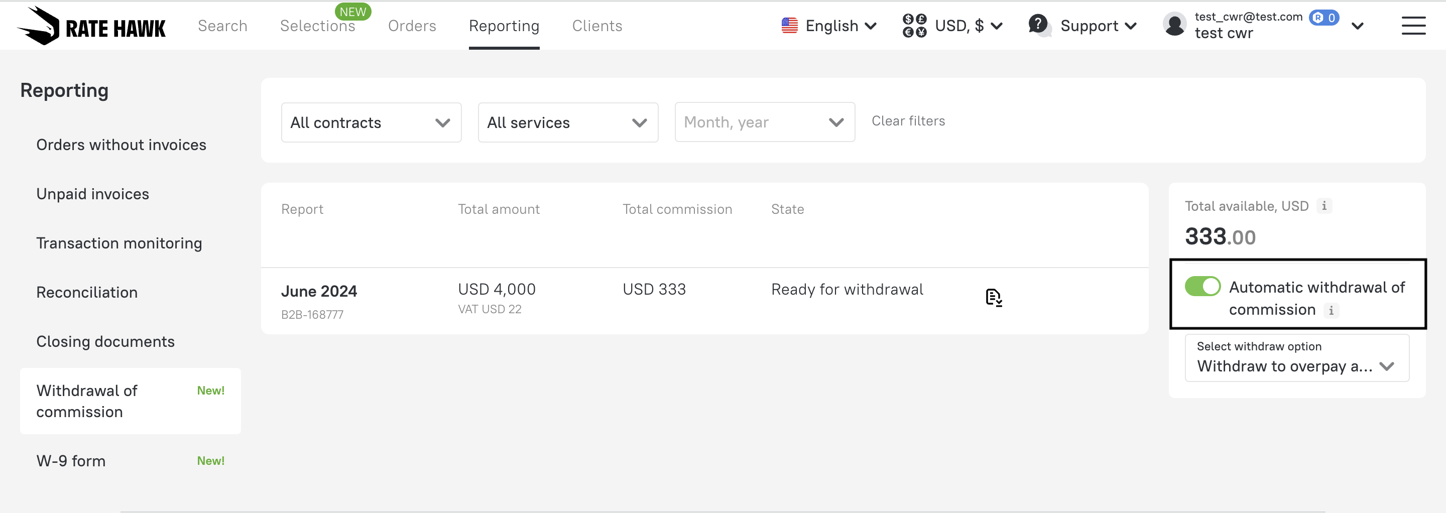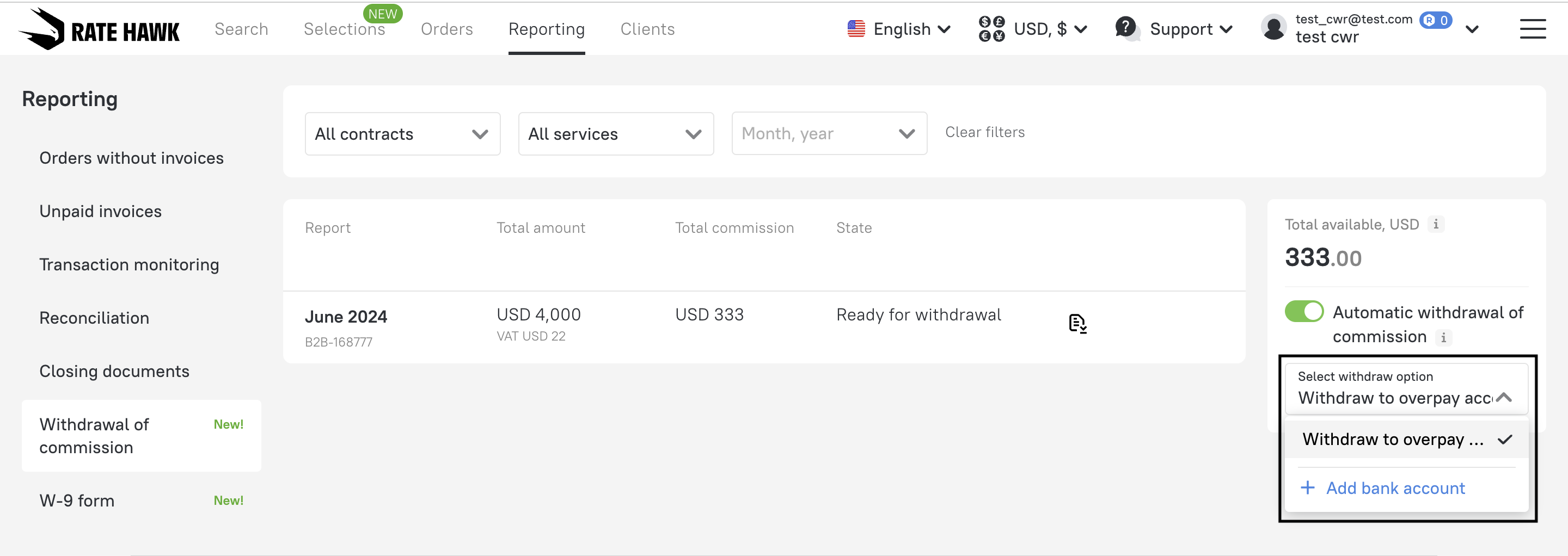 1. Navigate to “Withdrawal of commission” under the “Reporting” tab.