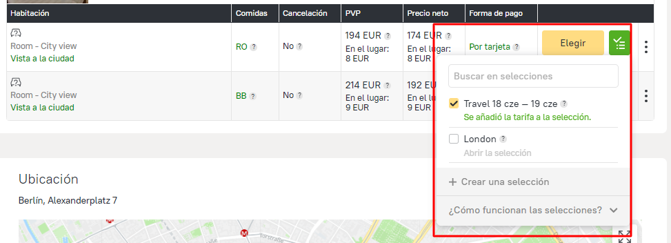 Se creó el botón Crear selección a la página del hotel. Puedes usarlo para crear una selección nueva o añadir una tarifa a una selección existente, sin tener que salir de la página del hotel.