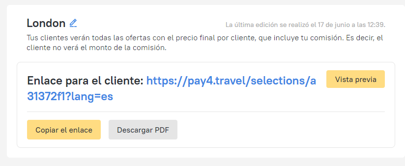 Puedes enviarle al cliente un enlace con las selecciones que creaste o descargar un PDF. En cualquier caso, el cliente solo verá los precios finales, incluida tu mark-up. Además, puedes establecer mark-up diferente para cada tarifa.