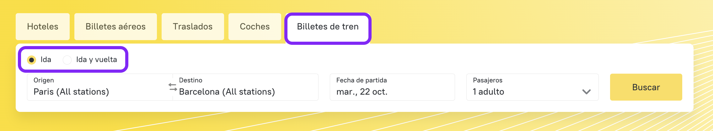 - Introduce tu destino y el número de pasajeros.