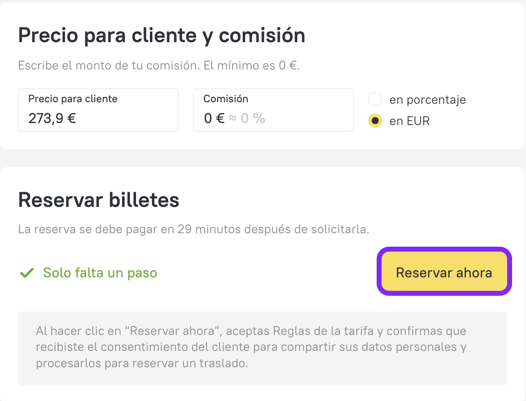 - Introduce los datos del pasajero en la página de reserva, revisa las normas de la tarifa y procede al pago.