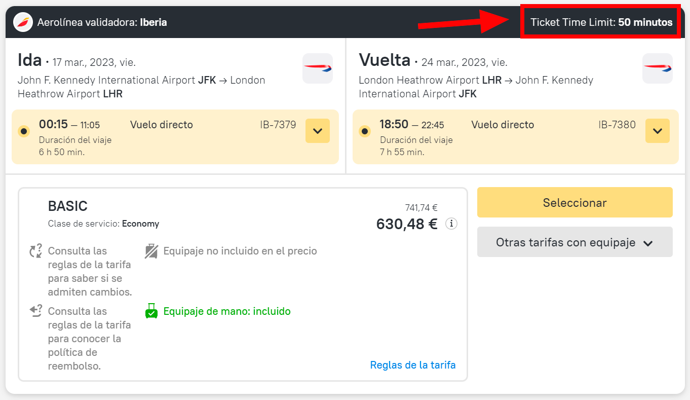Una reserva se considerará cancelada cuando no se haya emitido el billete. Para evitar esta situación, debes fijarte en el límite de tiempo (el período durante el cual puedes pedir la emisión del billete). Puedes consultarlo en la esquina superior derecha del cuadro de opciones del itinerario.