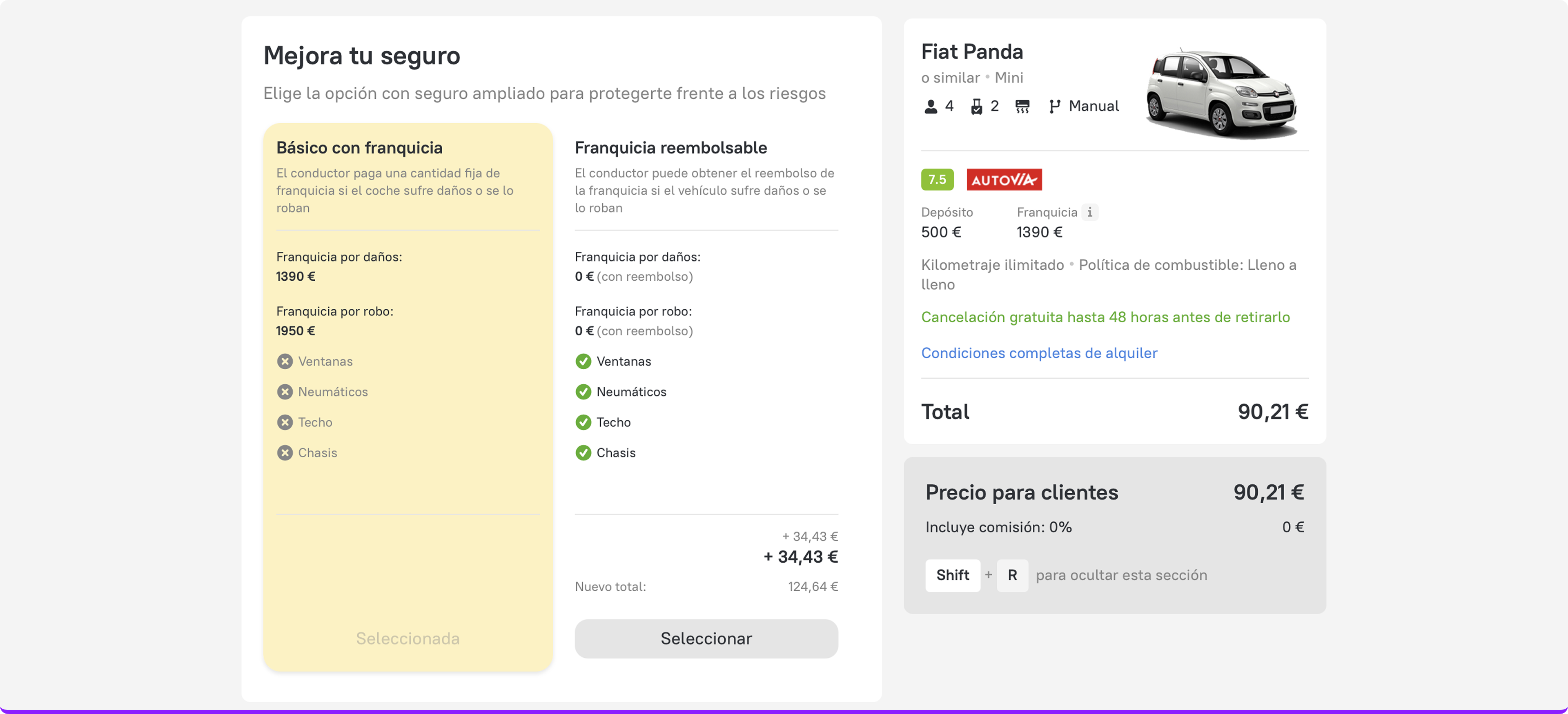 Al seleccionar un plan de seguro con franquicia básica, ahora verás una o varias opciones mejoradas, según la disponibilidad. Facilitamos la comparación del coste y la cobertura en paralelo, para que puedas reservar de forma más rápida e inteligente.