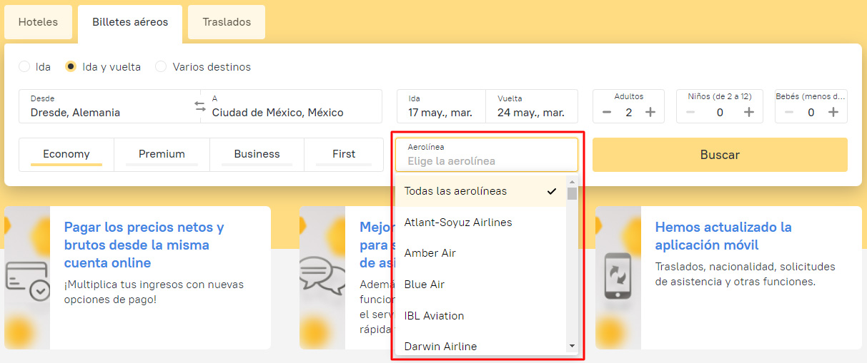 Gracias a la nueva función, puedes filtrar la búsqueda por aerolínea en simultáneo con la elección de destino y la fecha de vuelo. De esta manera, los resultados de la búsqueda incluyen todas las ofertas de la aerolínea seleccionada. Esto resulta muy práctico para los destinos más populares, para los que diversas aerolíneas ofrecen muchas opciones y no todas aparecen en los resultados de búsqueda.