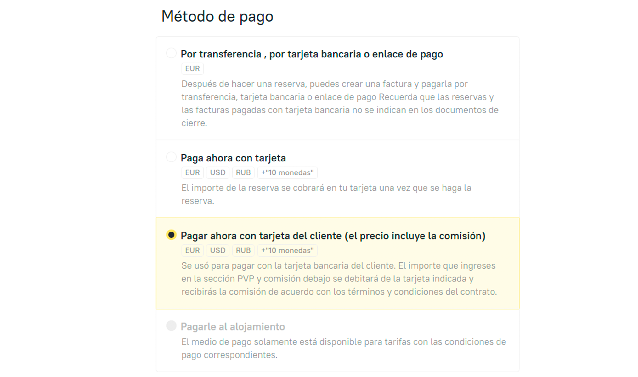 - Al realizar la reserva, selecciona el método de pago Pagar ahora con tarjeta del cliente (el precio incluye la comisión).