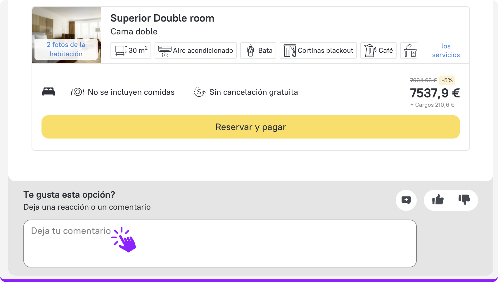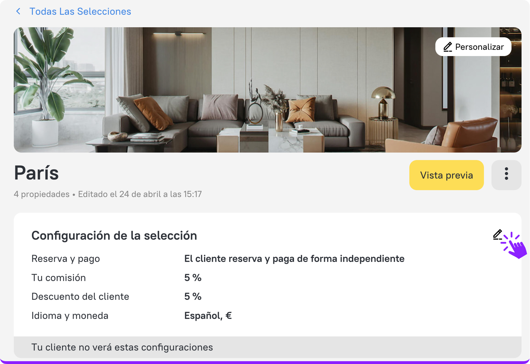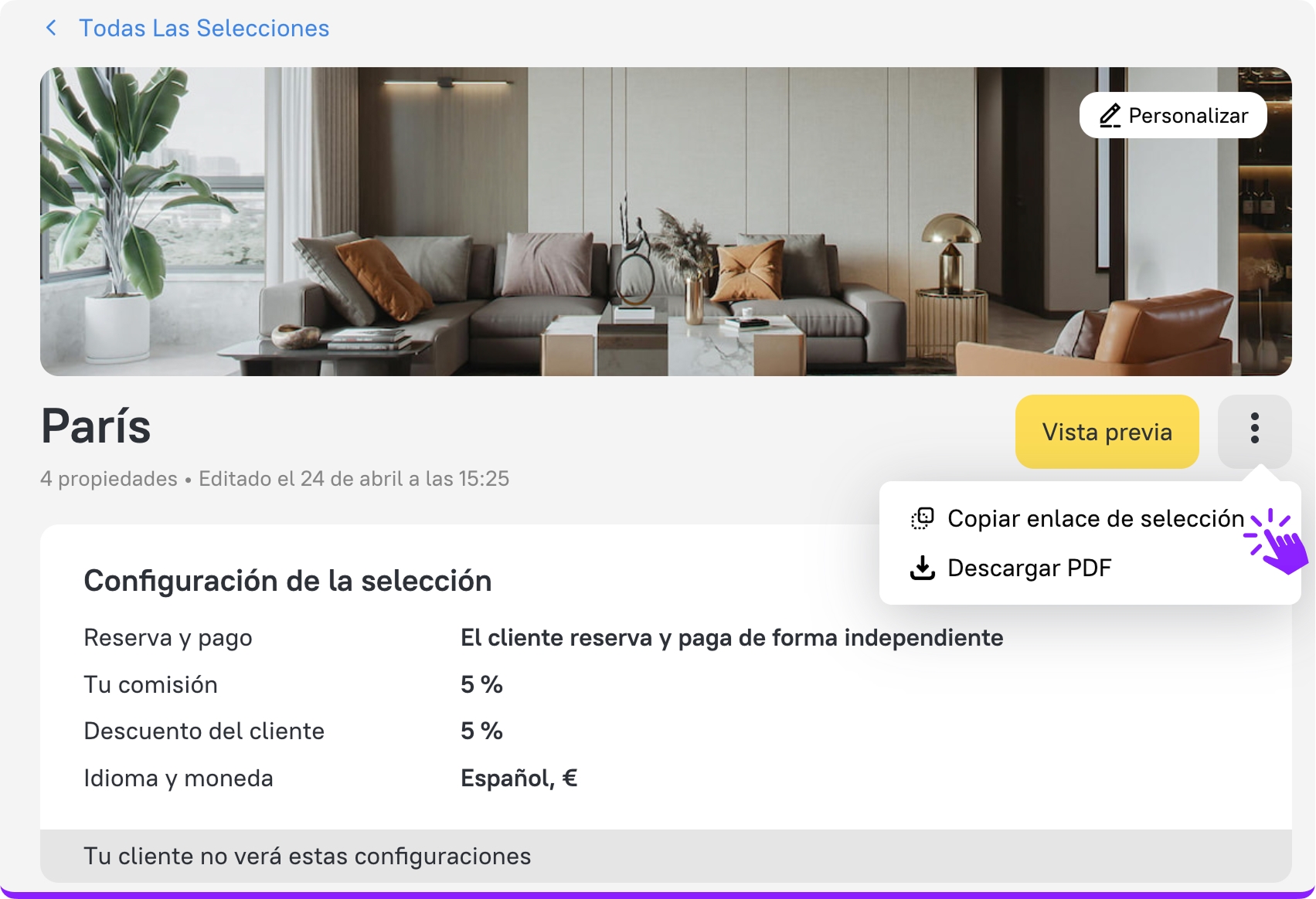 Deja de tratar de adivinar las preferencias de tus clientes: ahora, pueden reaccionar y compartir comentarios directamente en la propia Selección. Esto te ayudará a comprender mejor sus elecciones, a ajustar más rápidamente tus ofertas y a convertir tus Selecciones en reservas confirmadas con mayor eficiencia.