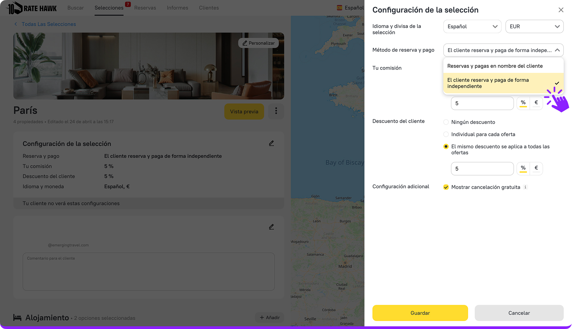3. En «Métodos de reserva y pago», elige «El cliente reserva y paga de forma independiente».