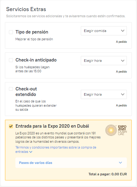 - Selecciona el tipo de entrada que quieres en la sección de servicios adicionales de la página de reserva del hotel.