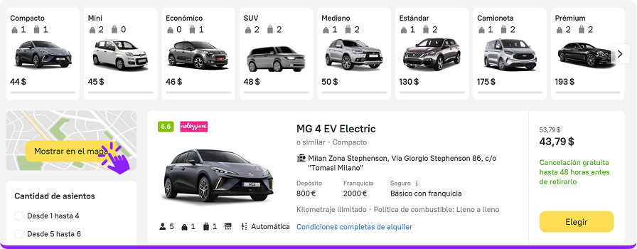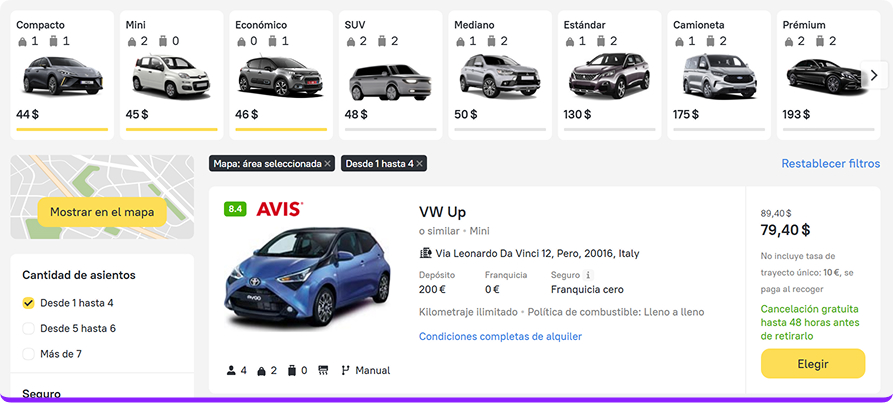 3. Filtra los resultados según criterios prácticos: categoría de coche, cobertura de seguro y más.