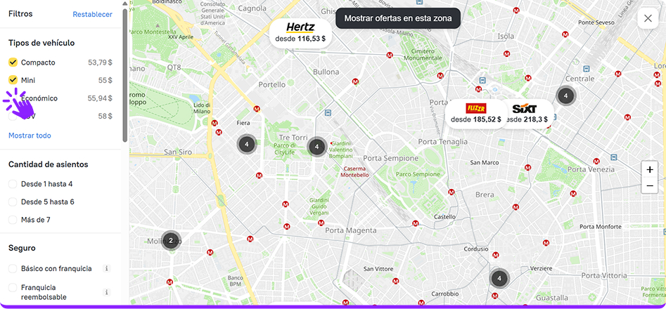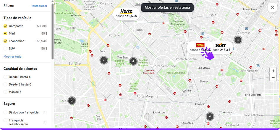 Gracias a la nueva función del mapa, puedes identificar fácilmente las oficinas de alquiler dentro de un área concreta y comparar las ofertas disponibles en la zona. Esto te permite tomar decisiones de reserva más rápidas y encontrar puntos de recogida competitivos para tus clientes.