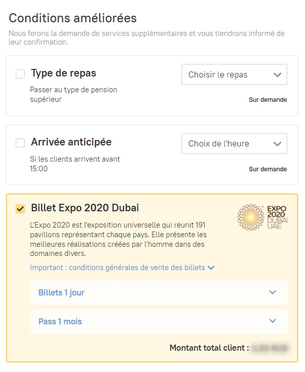 - Sélectionnez le type de billet souhaité sur la page de réservation de l’hôtel, dans la rubrique Services supplémentaires.