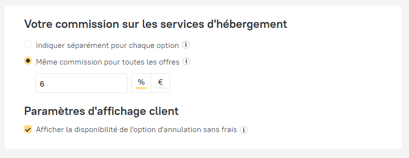 - Définissez le montant de la commission et les paramètres de visibilité pour votre client. Ici, vous pouvez opter pour un montant ou pourcentage de commission uniforme pour tous les tarifs ou les indiquer pour chaque offre séparément.