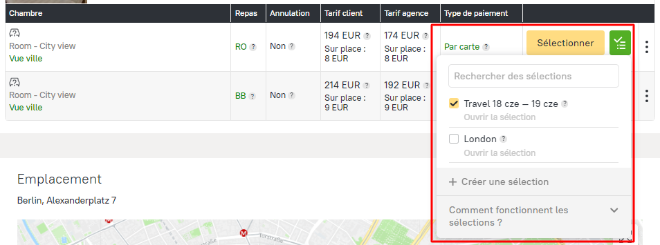 Vous pouvez également créer une toute nouvelle sélection depuis la page de résultats de l’hôtel au moment de la sélection du tarif. Cependant, n’oubliez pas de revenir à la section Sélections pour remplir la commission et le descriptif pour votre client.