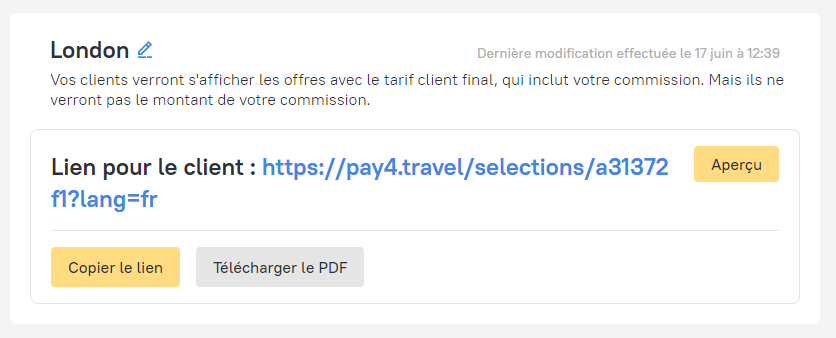 Vous pouvez envoyer au client un lien vers n’importe quelle offre commerciale que vous avez créée ou télécharger un fichier pdf. Dans les deux cas, le client ne verra que les prix finaux, comprenant votre commission. De plus, vous pouvez définir une commission différente pour chaque tarif!