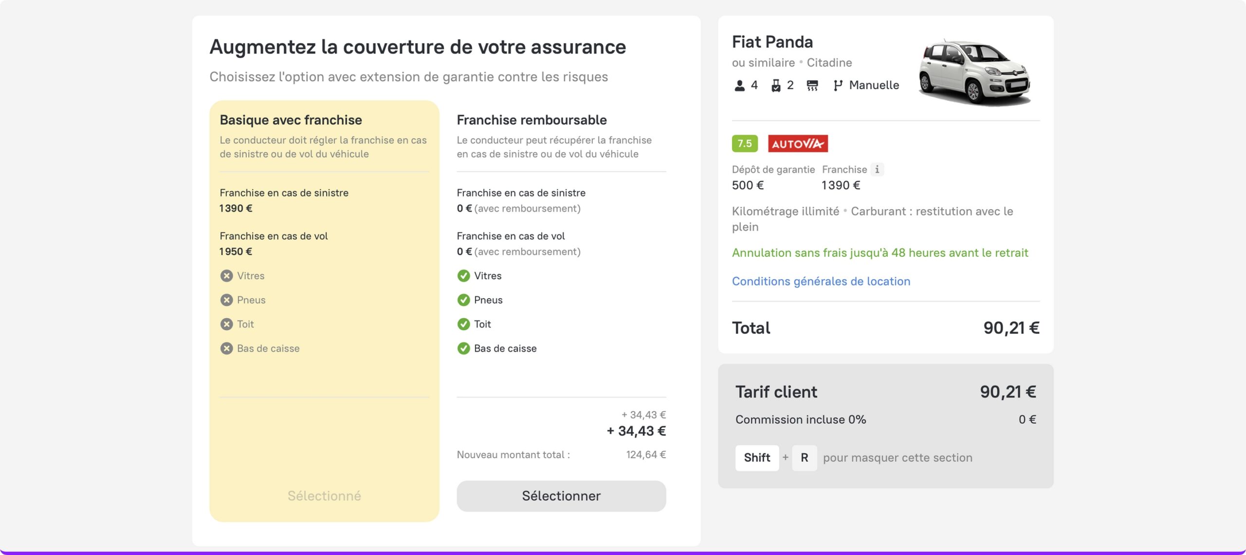 L’assurance pour la location de voitures devient encore plus flexible. En choisissant une formule de base avec franchise, vous verrez désormais les options d’assurance disponibles directement dans le formulaire de réservation. Cela vous permet de comparer facilement les niveaux de couverture et de sélectionner l’option la plus adaptée.
