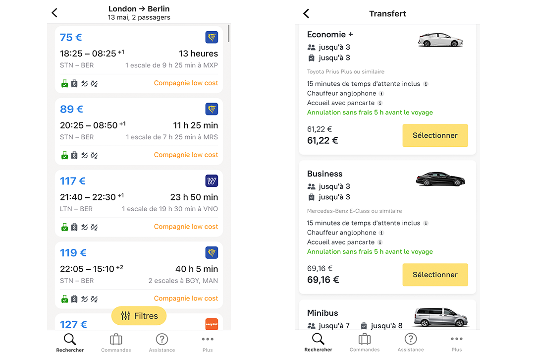 Nous avons enrichi l’application mobile d’une fonctionnalité pour réserver des billets d’avion et des transferts