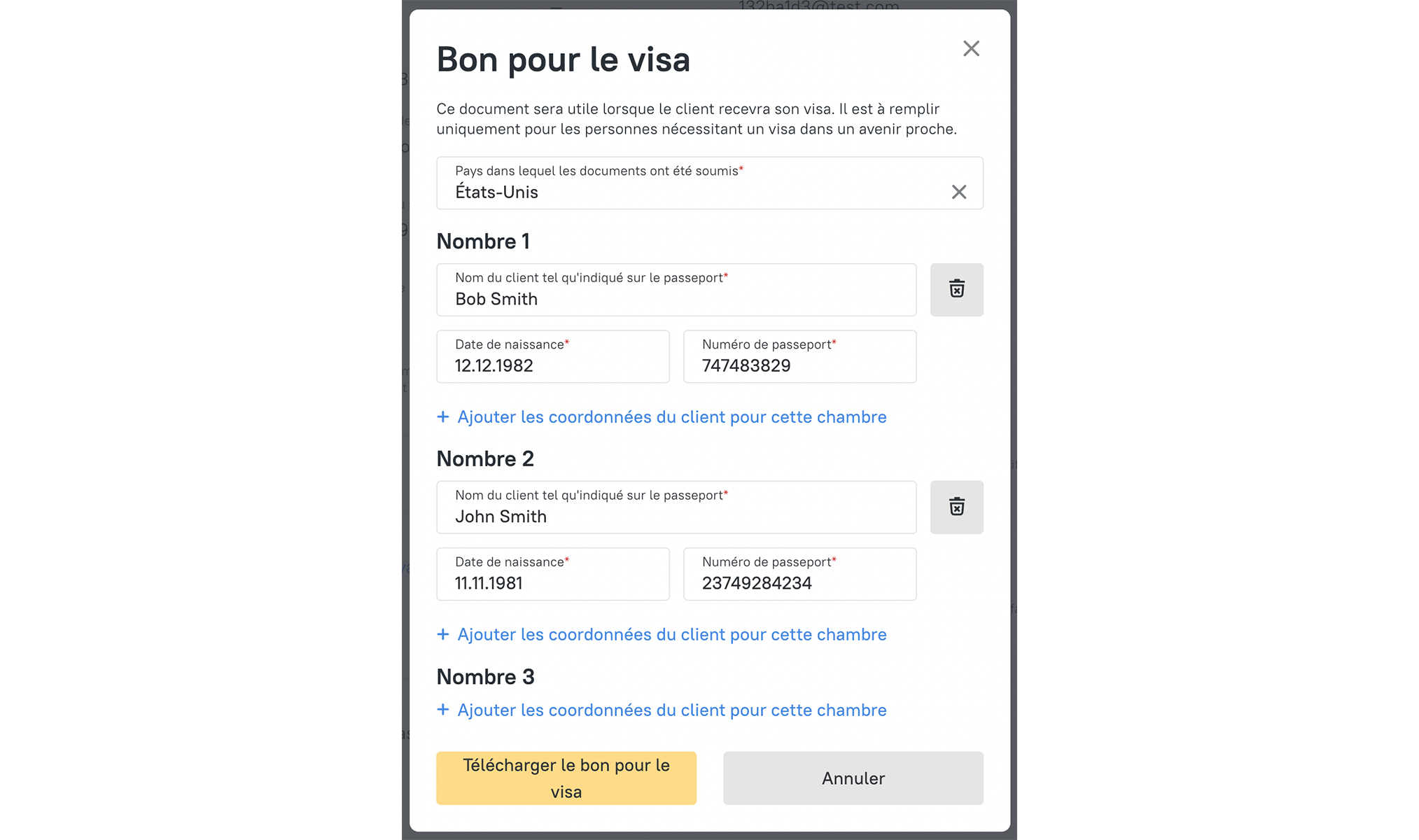 - Remplissez les informations du passeport du voyageur et cliquez sur Télécharger le bon pour le visa. Si la réservation est pour deux personnes ou plus, cliquez sur Ajouter les coordonnées du client pour cette chambre. Si la réservation concerne plusieurs chambres, vous pouvez remplir les détails de tous les voyageurs dans la même fenêtre.
