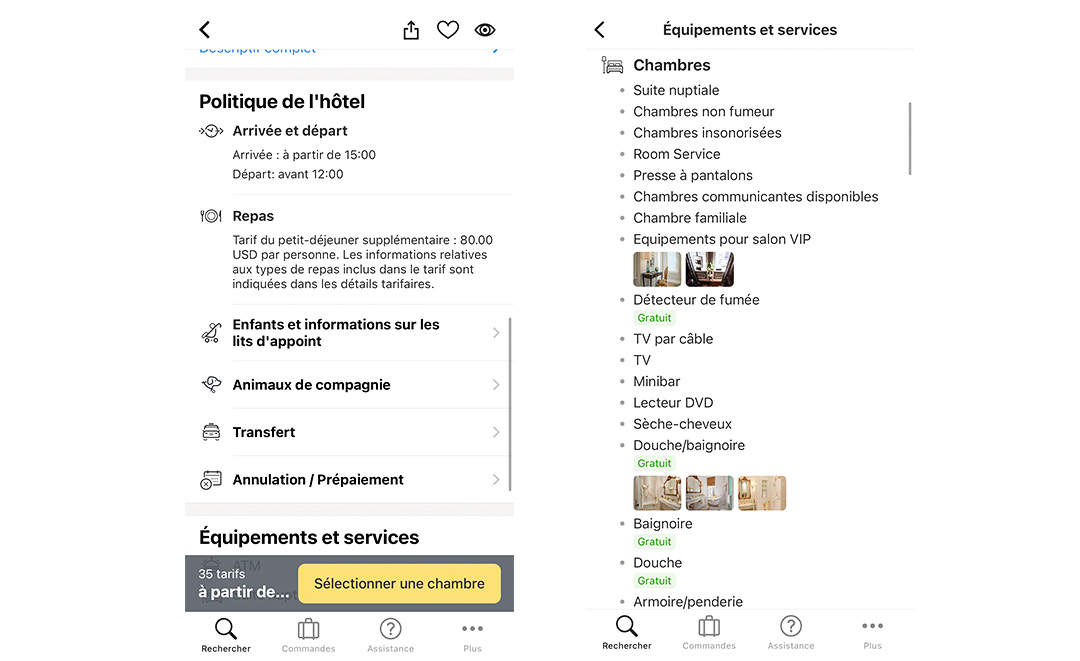 - les équipements gratuits mis à disposition par l’hôtel sont mis en évidence et leurs photos sont affichées;