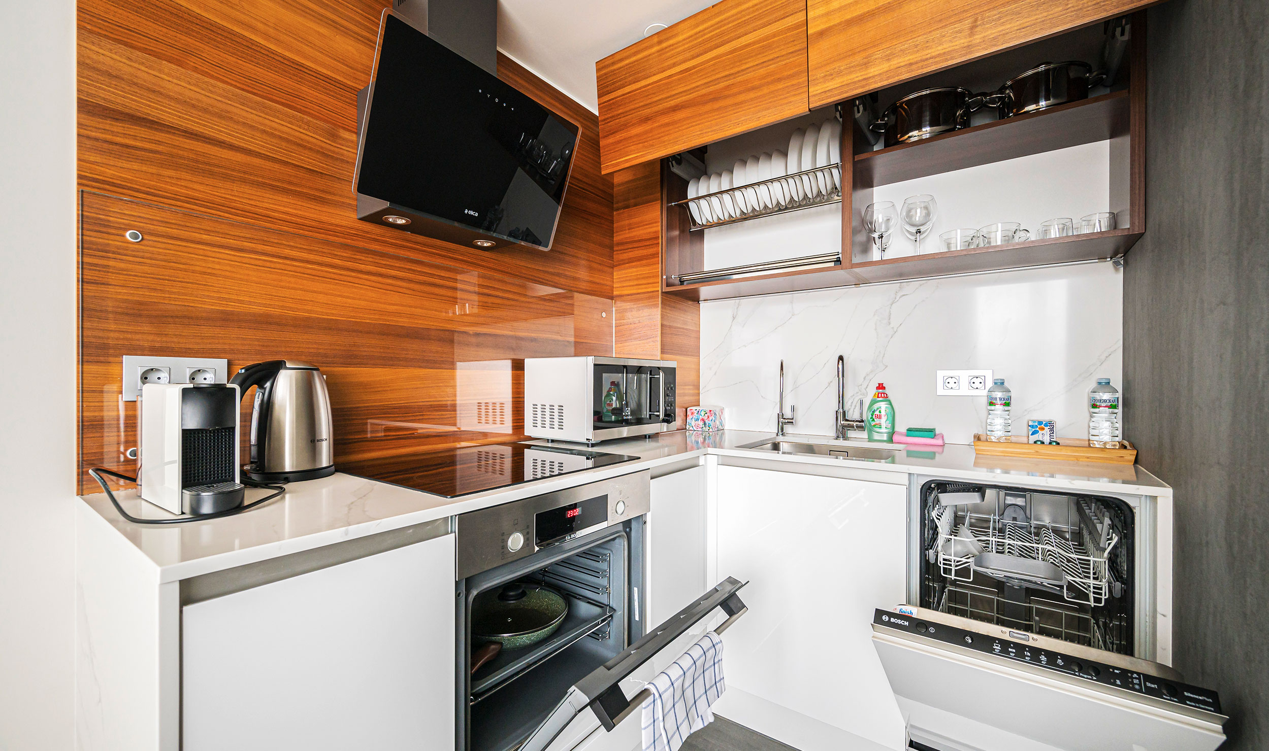 - A kitchen with a dishwasher, microwave and washer dryer;