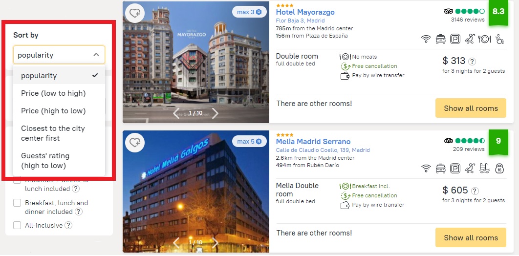 In order to get search results in a useful order, choose a filtering option: by price (low to high or high to low), guests’ rating (high to low), or by distance from the city center, with the closest to the city center first.
