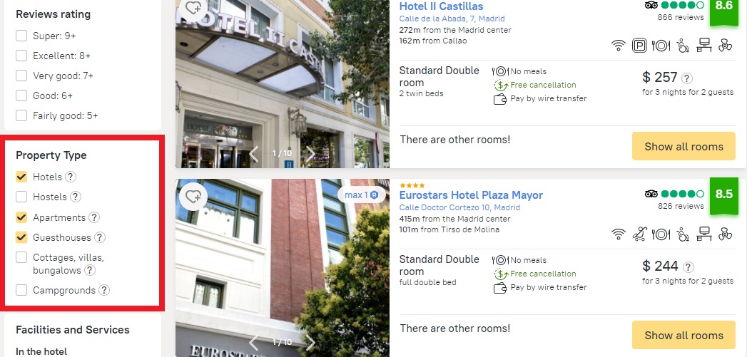 Take note also of the Accommodation features set of filters: here you can specify if children are part of your group, whether you want a hotel where animals are allowed, or whether you need a hotel where conditions are appropriate for stays by disabled travelers.