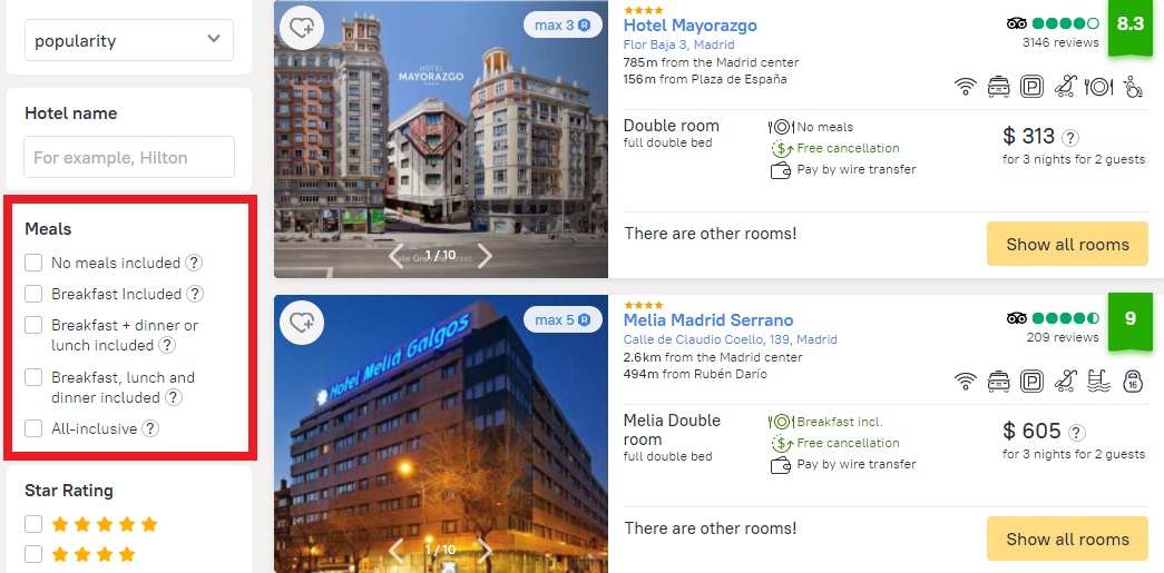 Filtering is highly appropriate when your client is unsure what to go for when making a selection and wants to be guided by one of those parameters. Filtering will also make it easier when combined with other parameters — for example, with a certain meal type or whether the hotel provides specific services or amenities.
