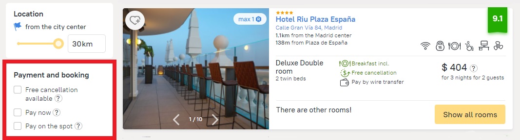 Here you can choose the booking payment option to pay at check-in and whether you can cancel for free. This last option is particularly important during the pandemic, when entry restrictions or the situation at the final destination point may impact plans, as may the client’s personal circumstances. Free cancelation gives you more room to maneuver and allows you to cancel bookings without paying a penalty up until a specific date.